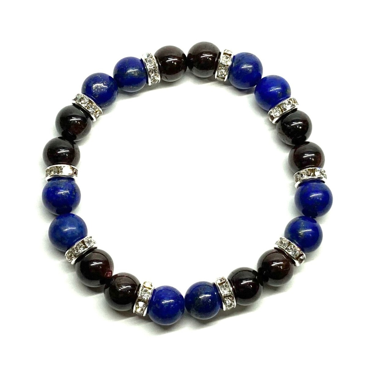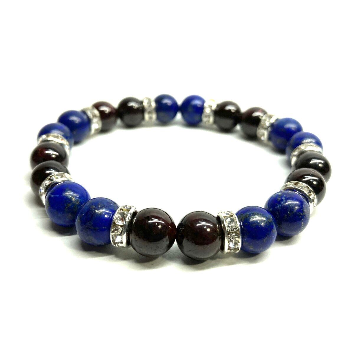 こちらは、8mm玉のラピスラズリとガーネットを使ったパワーストーンブレスレットです。シンプルなデザインでどんなコーディネートにも合わせやすいデザインに仕上げています。サイズは内周 約15cmです。気になる方は是非この機会にどうぞ。