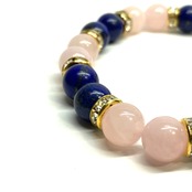 こちらは、8mm玉のラピスラズリとローズクォーツを使ったパワーストーンブレスレットです。シンプルなデザインでどんなコーディネートにも合わせやすいデザインに仕上げています。サイズは内周 約15cmです。気になる方は是非この機会にどうぞ。