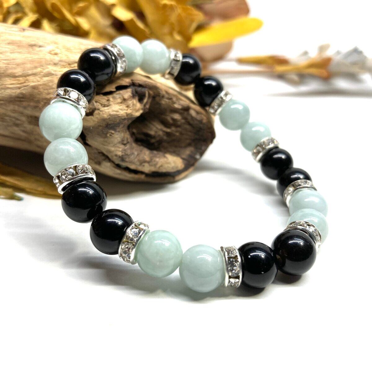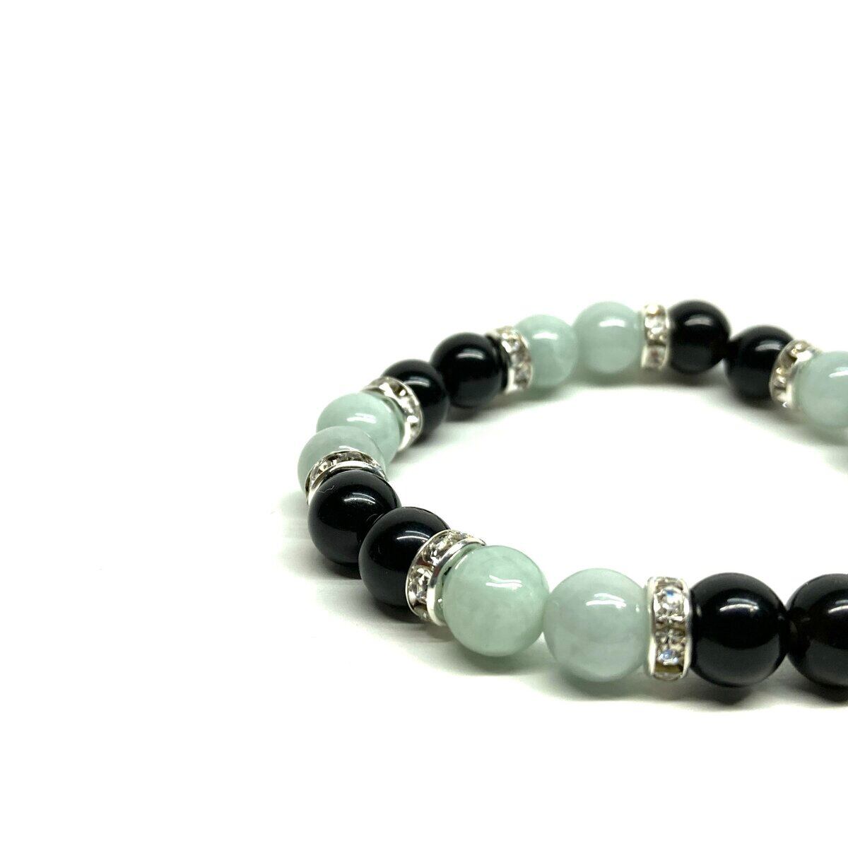 こちらは、8mm玉のモリオンとビルマ翡翠を使ったパワーストーンブレスレットです。シンプルなデザインでどんなコーディネートにも合わせやすいデザインに仕上げています。サイズは内周 約15cmです。気になる方は是非この機会にどうぞ。