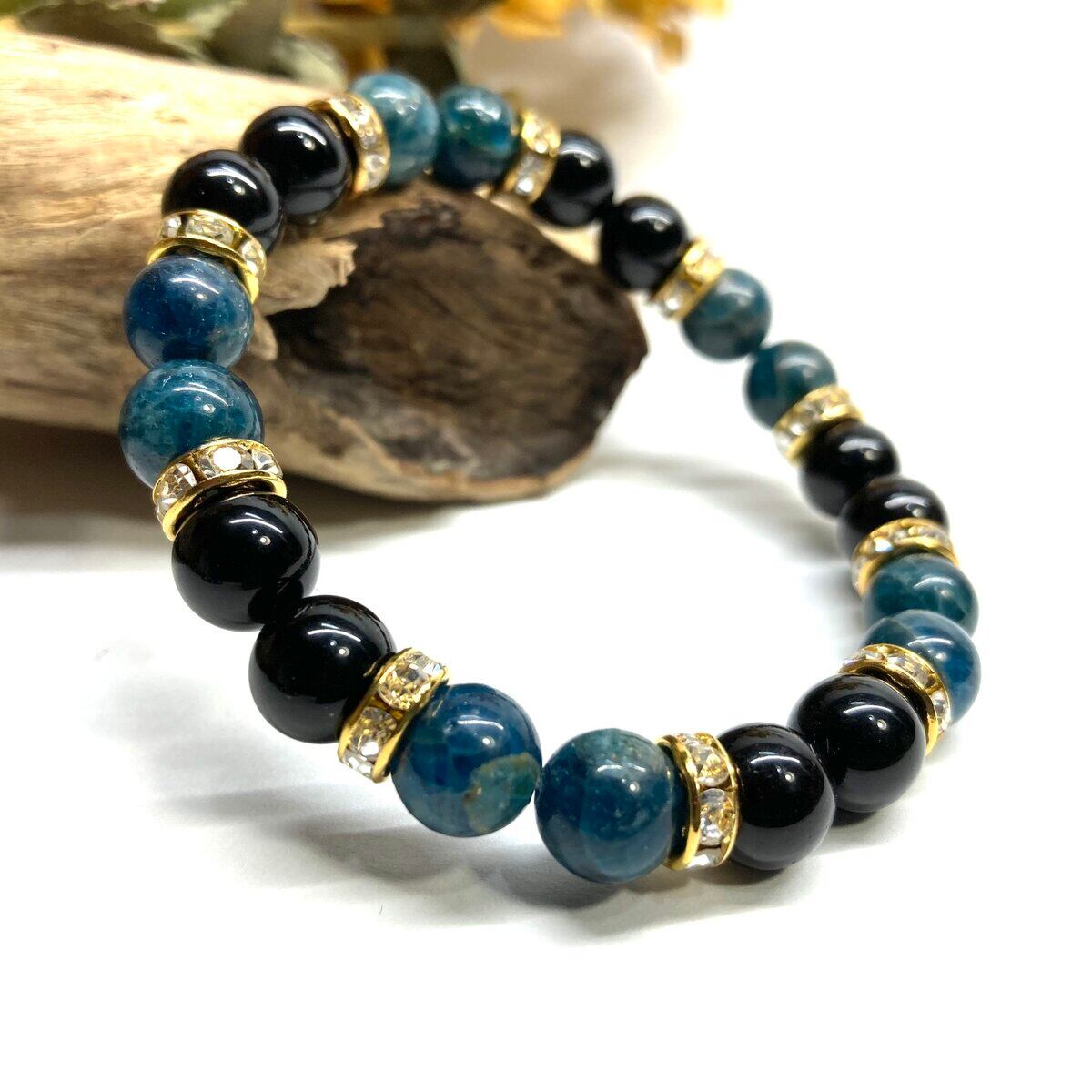 こちらは、8mm玉のモリオンとアパタイトを使ったパワーストーンブレスレットです。シンプルなデザインでどんなコーディネートにも合わせやすいデザインに仕上げています。サイズは内周 約15cmです。気になる方は是非この機会にどうぞ。