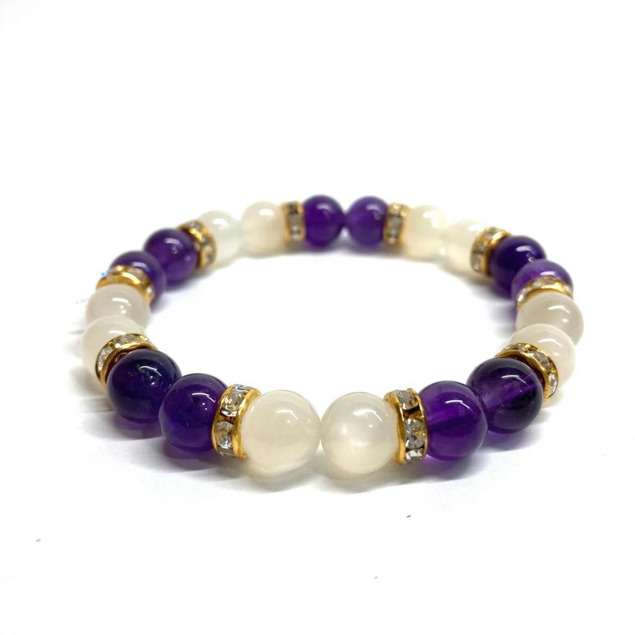 こちらは、8mm玉のムーンストーンとアメジストを使ったパワーストーンブレスレットです。シンプルなデザインでどんなコーディネートにも合わせやすいデザインに仕上げています。サイズは内周 約15cmです。気になる方は是非この機会にどうぞ。