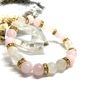こちらは、8mm玉のムーンストーンとローズクォーツを使ったパワーストーンブレスレットです。シンプルなデザインでどんなコーディネートにも合わせやすいデザインに仕上げています。サイズは内周 約15cmです。気になる方は是非この機会にどうぞ。