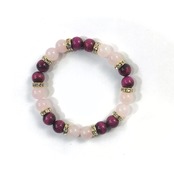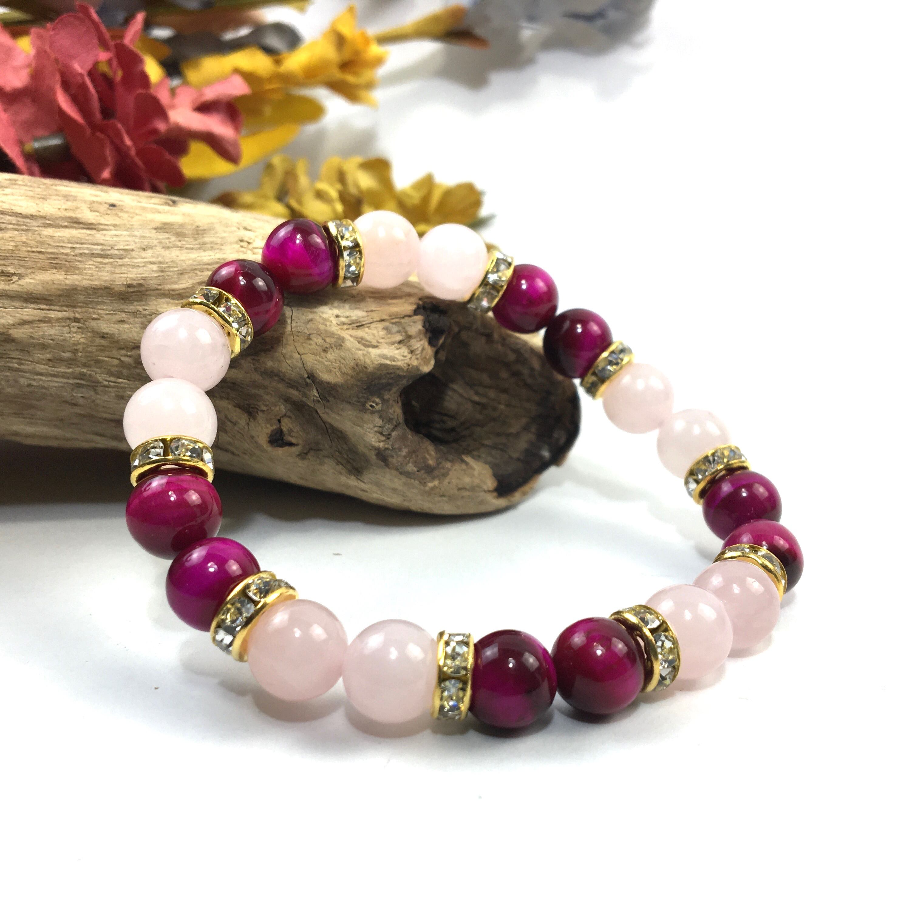 こちらは、8mm玉のローズクォーツとピンクタイガーアイを使ったパワーストーンブレスレットです。シンプルなデザインでどんなコーディネートにも合わせやすいデザインに仕上げています。サイズは内周約15cmです。気になる方は是非この機会にどうぞ。