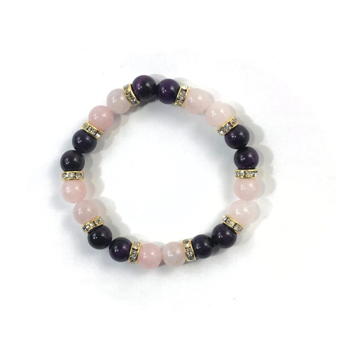 こちらは、8mm玉のローズクォーツとパープルタイガーアイを使ったパワーストーンブレスレットです。シンプルなデザインでどんなコーディネートにも合わせやすいデザインに仕上げています。サイズは内周約15cmです。気になる方は是非この機会にどうぞ。