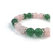 こちらは、8mm玉のローズクォーツと緑瑪瑙を使ったパワーストーンブレスレットです。シンプルなデザインでどんなコーディネートにも合わせやすいデザインに仕上げています。サイズは内周約15cmです。気になる方は是非この機会にどうぞ。