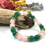こちらは、8mm玉のローズクォーツと緑瑪瑙を使ったパワーストーンブレスレットです。シンプルなデザインでどんなコーディネートにも合わせやすいデザインに仕上げています。サイズは内周約15cmです。気になる方は是非この機会にどうぞ。