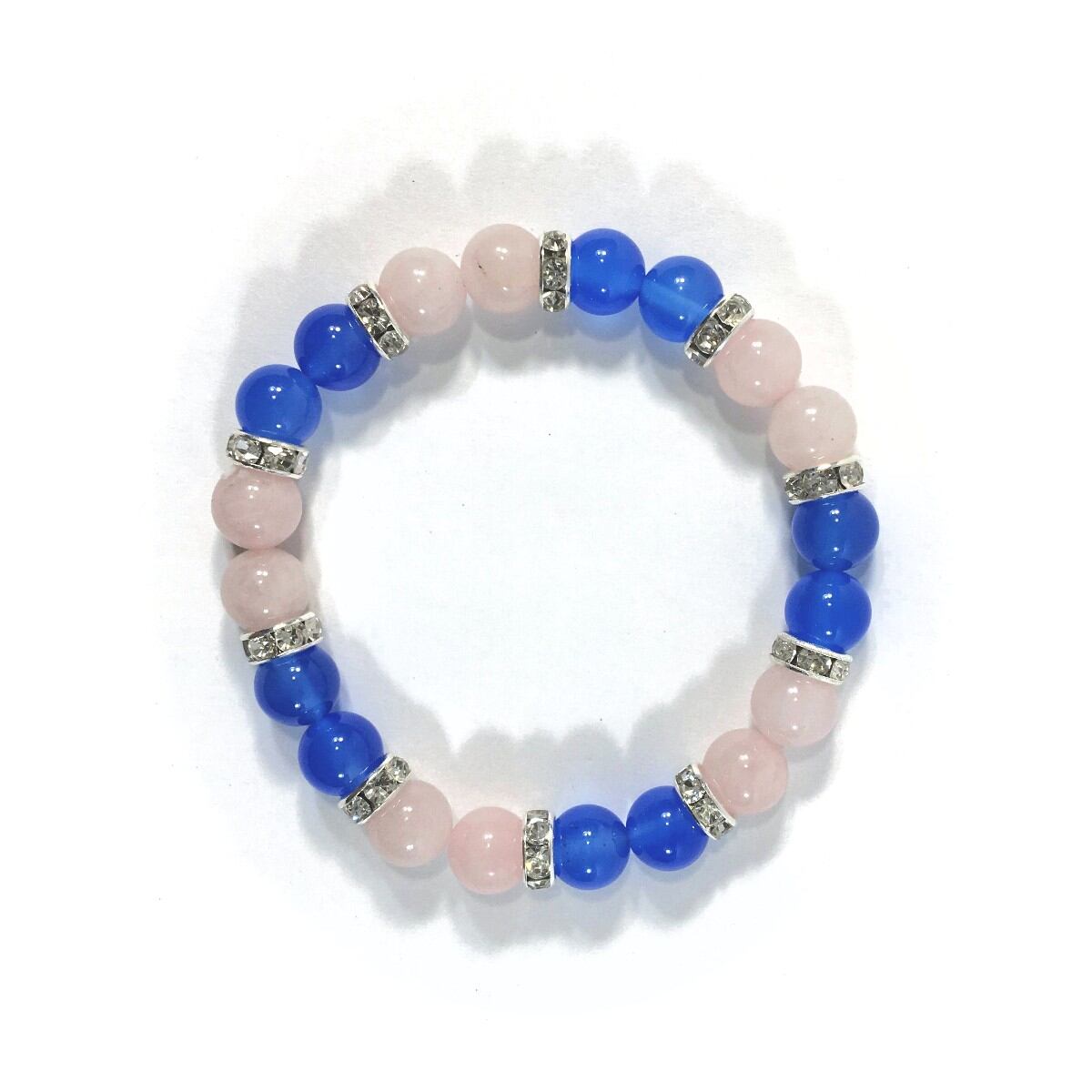 こちらは、8mm玉のローズクォーツとブルーメノウを使ったパワーストーンブレスレットです。シンプルなデザインでどんなコーディネートにも合わせやすいデザインに仕上げています。サイズは内周約15cmです。気になる方は是非この機会にどうぞ。