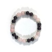 こちらは、8mm玉のローズクォーツとガーネットを使ったパワーストーンブレスレットです。シンプルなデザインでどんなコーディネートにも合わせやすいデザインに仕上げています。サイズは内周約15cmです。気になる方は是非この機会にどうぞ。