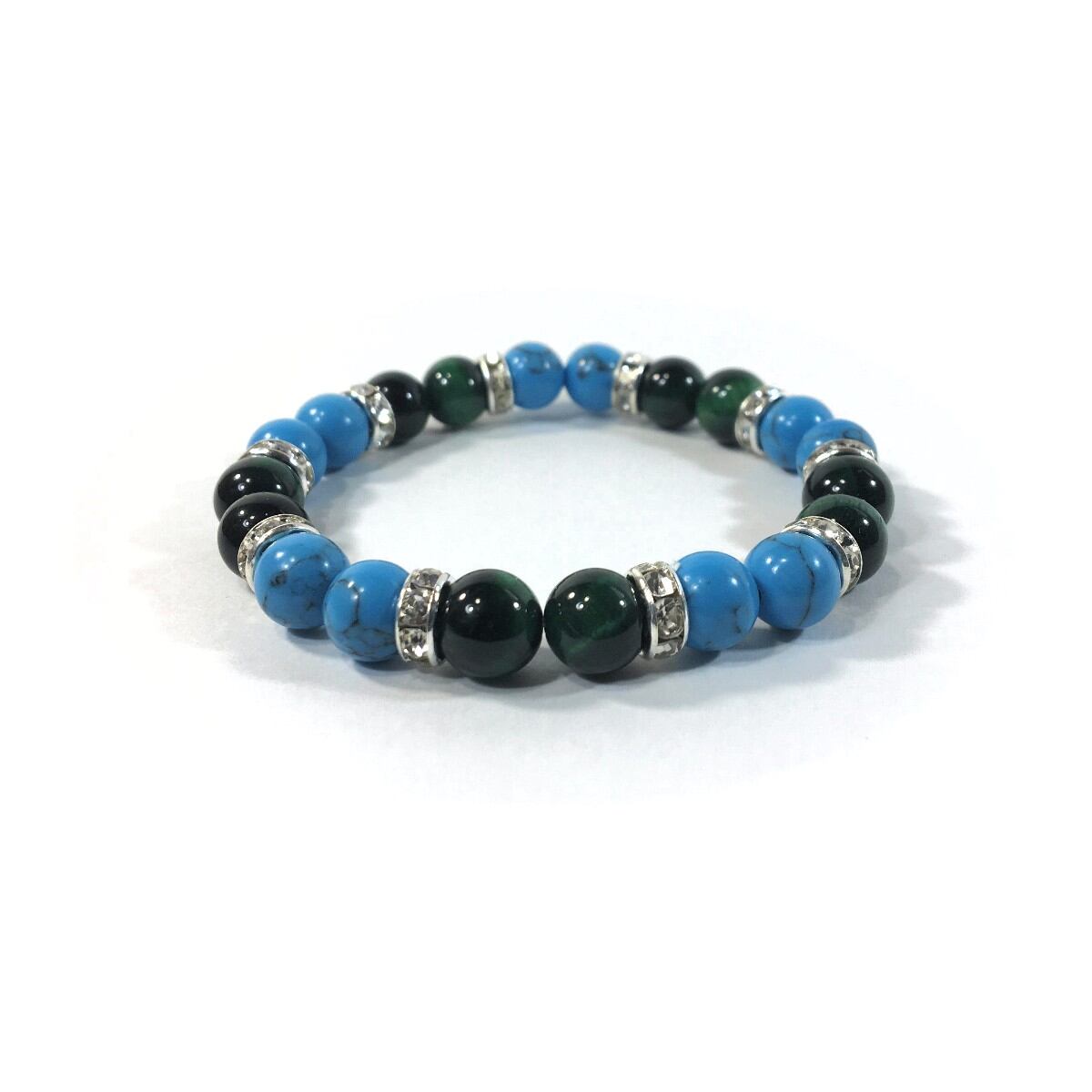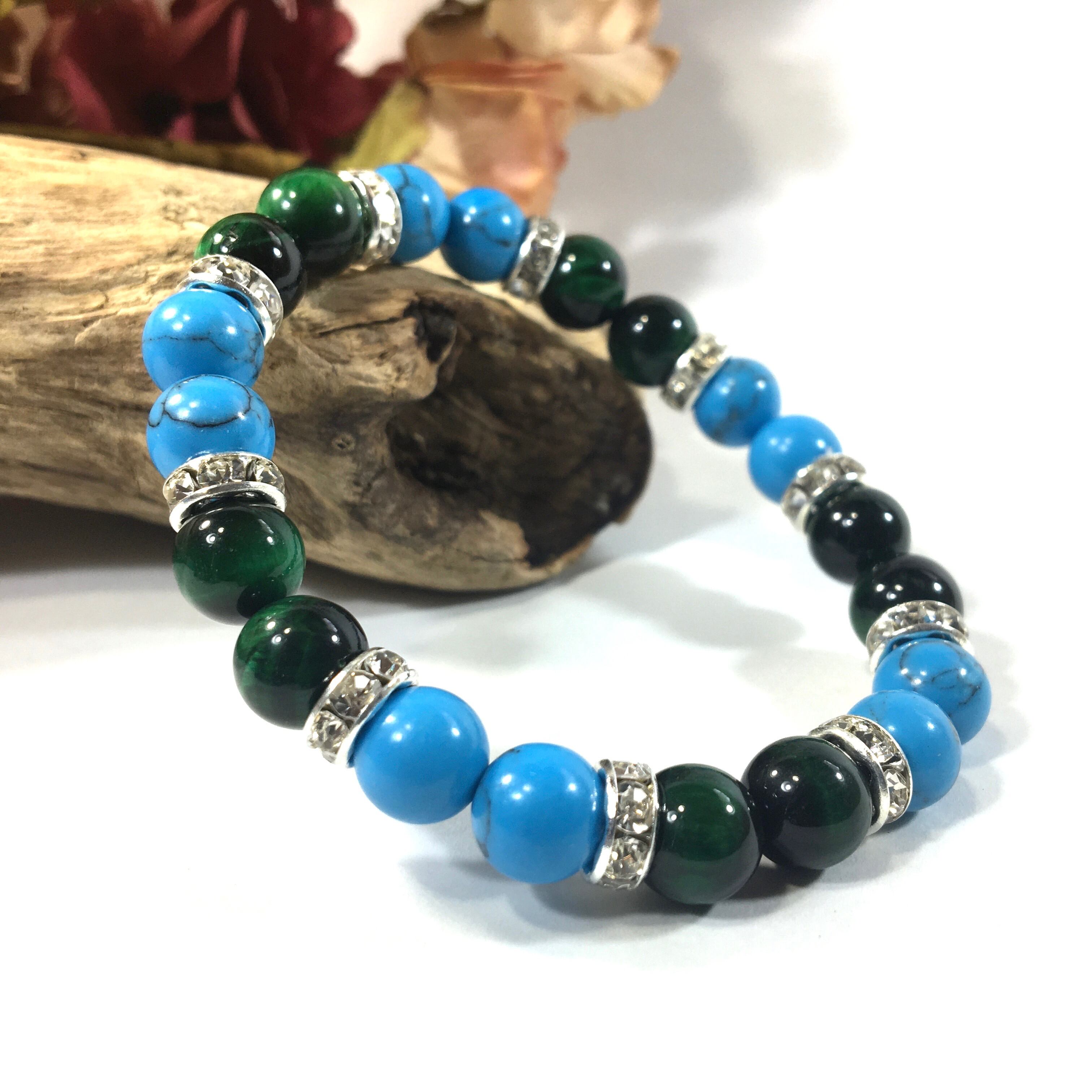 こちらは、8mm玉のターコイズとグリーンタイガーアイを使ったパワーストーンブレスレットです。シンプルなデザインでどんなコーディネートにも合わせやすいデザインに仕上げています。サイズは内周約15cmです。気になる方は是非この機会にどうぞ。