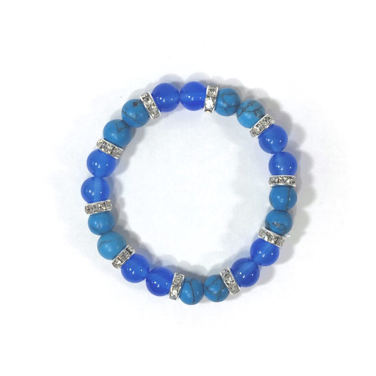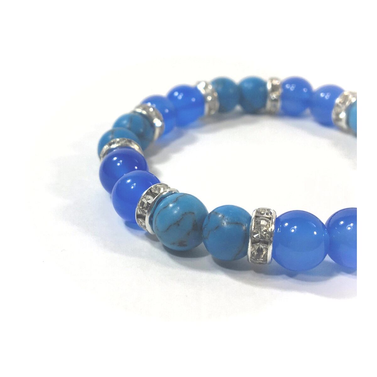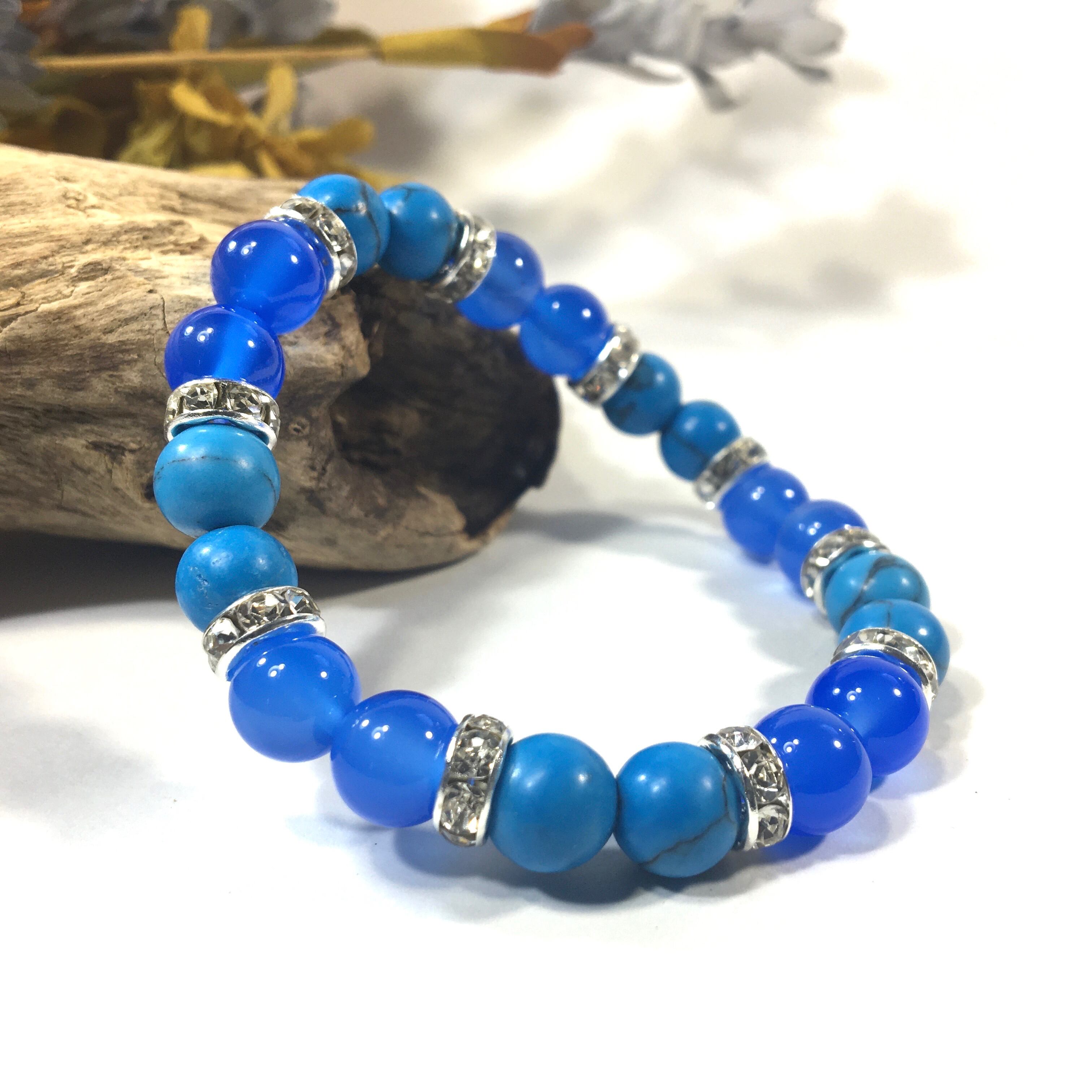 こちらは、8mm玉のターコイズとブルーメノウを使ったパワーストーンブレスレットです。シンプルなデザインでどんなコーディネートにも合わせやすいデザインに仕上げています。サイズは内周約15cmです。気になる方は是非この機会にどうぞ。