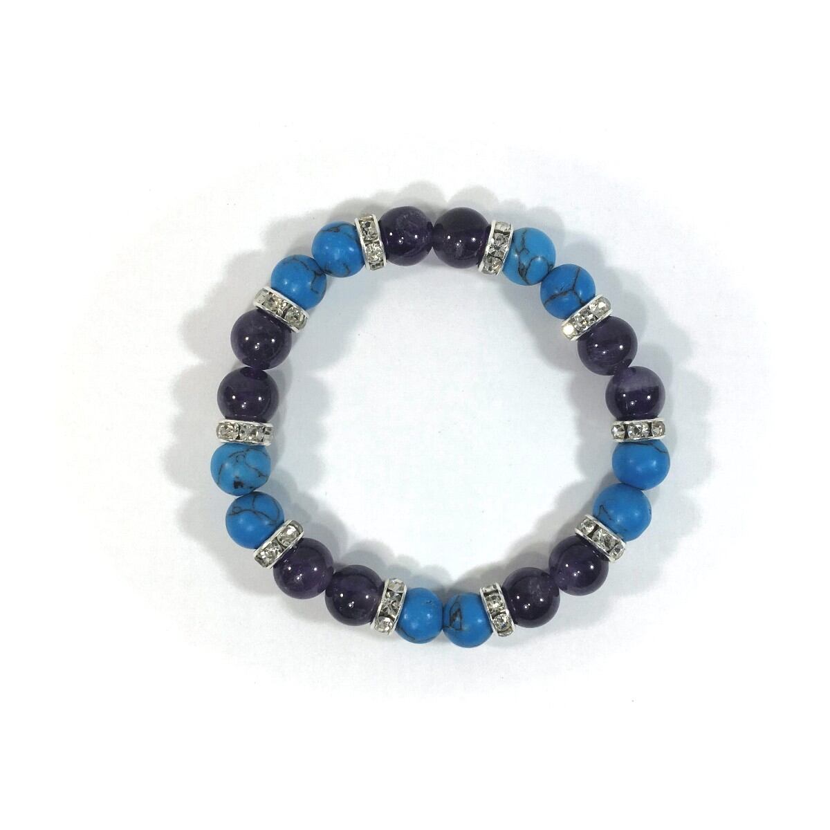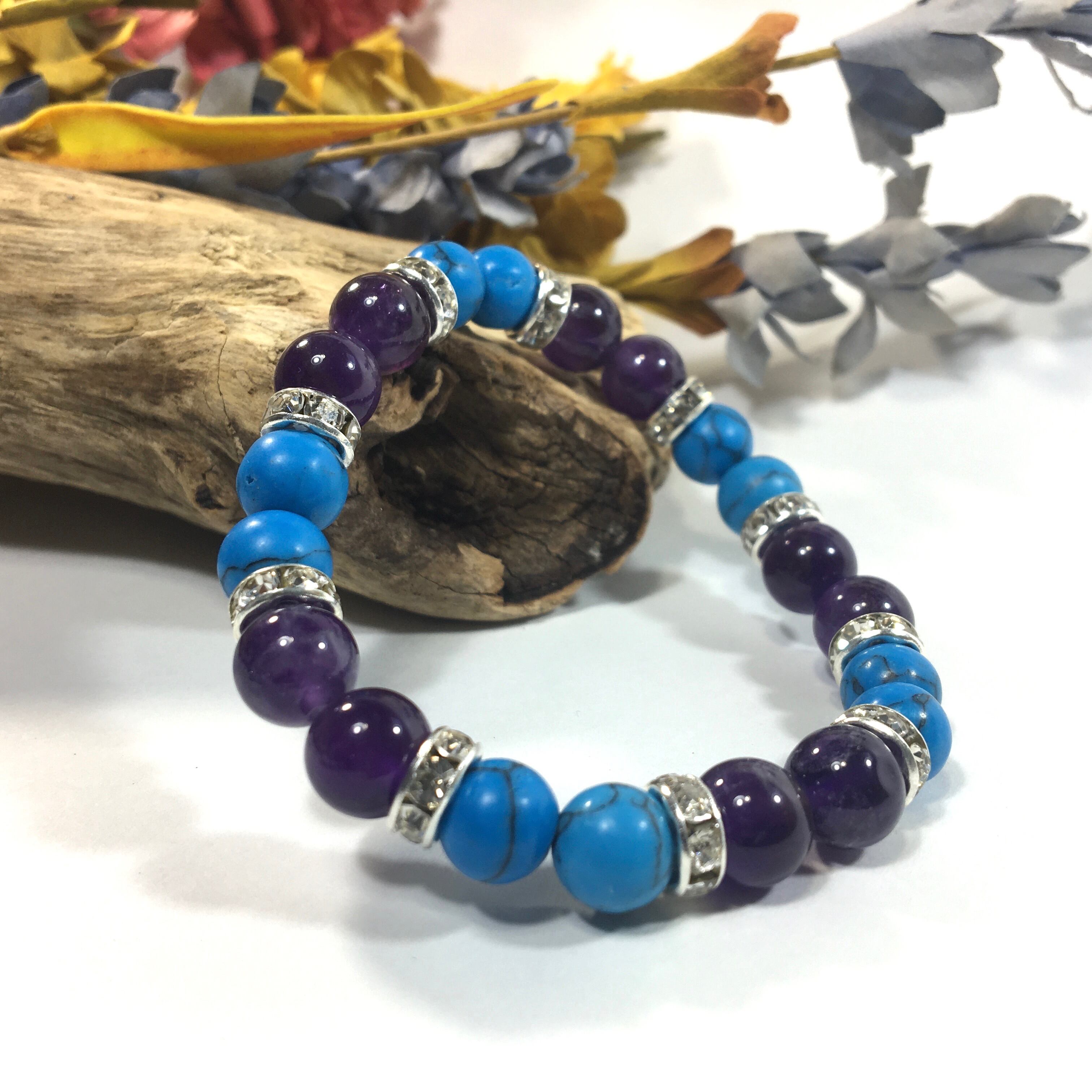 こちらは、8mm玉のターコイズとアメジストを使ったパワーストーンブレスレットです。シンプルなデザインでどんなコーディネートにも合わせやすいデザインに仕上げています。サイズは内周約15cmです。気になる方は是非この機会にどうぞ。