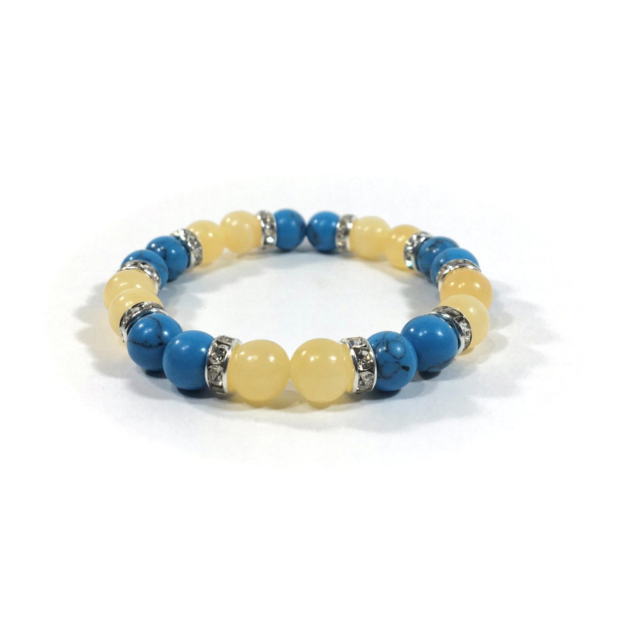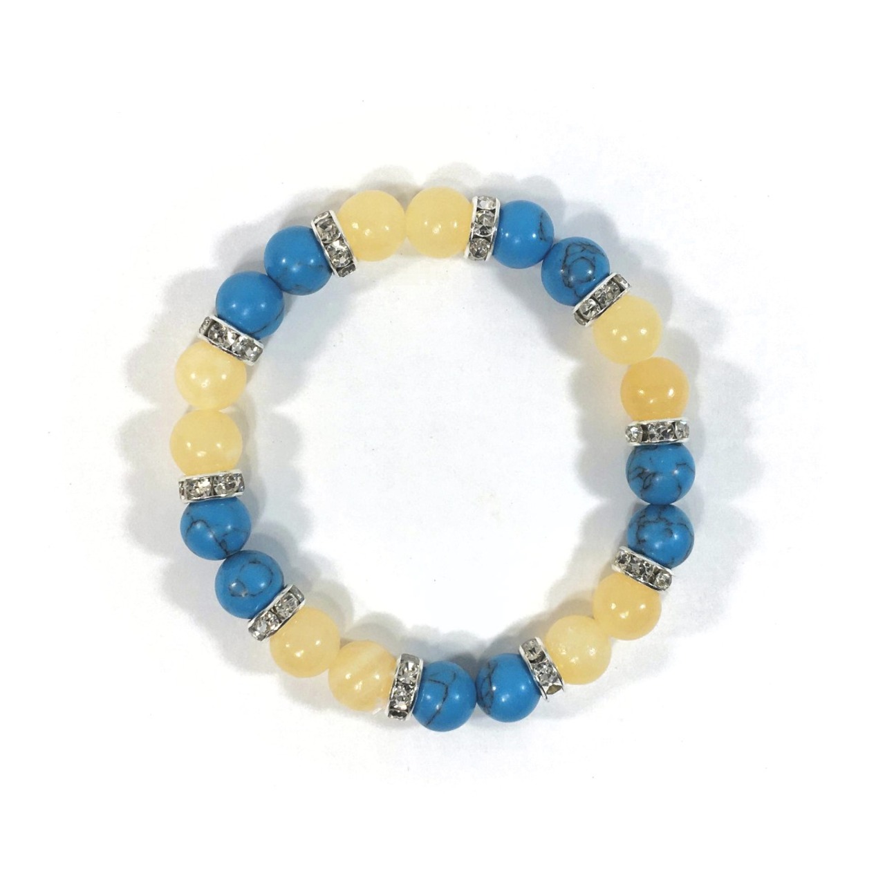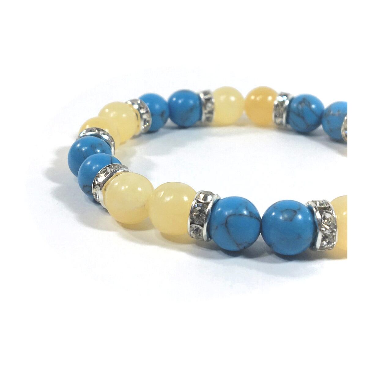 こちらは、8mm玉のターコイズとアラゴナイトを使ったパワーストーンブレスレットです。シンプルなデザインでどんなコーディネートにも合わせやすいデザインに仕上げています。サイズは内周約15cmです。気になる方は是非この機会にどうぞ。