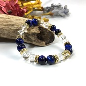 こちらは、8mm玉の水晶とブルータイガーアイを使ったパワーストーンブレスレットです。シンプルなデザインでどんなコーディネートにも合わせやすいデザインに仕上げています。サイズは内周約15cmです。気になる方は是非この機会にどうぞ。