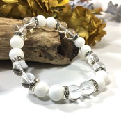 こちらは、8mm玉の水晶とホワイトオニキスを使ったパワーストーンブレスレットです。シンプルなデザインでどんなコーディネートにも合わせやすいデザインに仕上げています。サイズは内周約15cmです。気になる方は是非この機会にどうぞ。