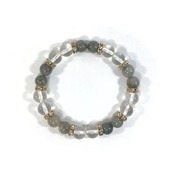 こちらは、8mm玉の水晶とラブラドライトを使ったパワーストーンブレスレットです。シンプルなデザインでどんなコーディネートにも合わせやすいデザインに仕上げています。サイズは内周約15cmです。気になる方は是非この機会にどうぞ。