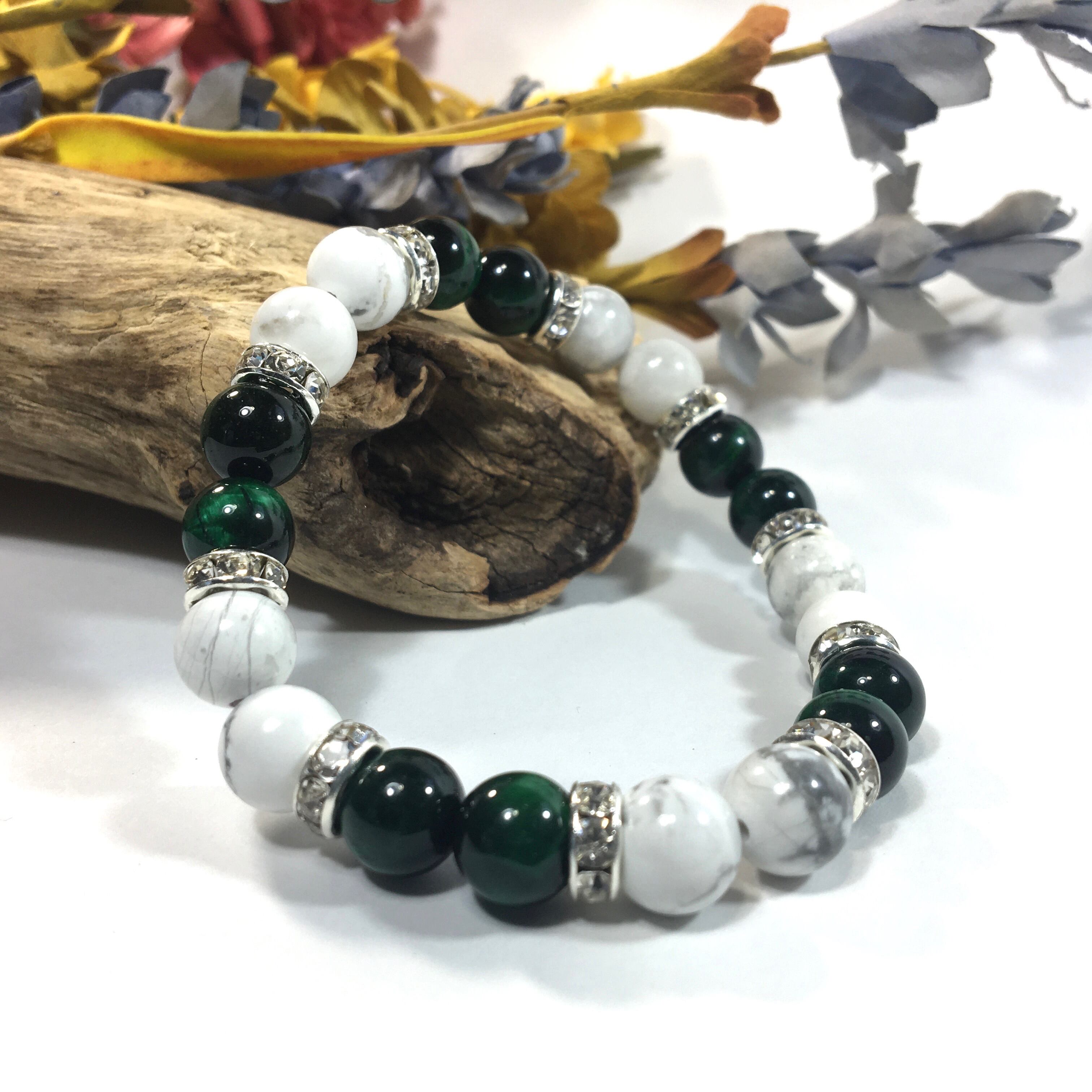 こちらは、8mm玉のハウライトとグリーンタイガーアイを使ったパワーストーンブレスレットです。シンプルなデザインでどんなコーディネートにも合わせやすいデザインに仕上げています。サイズは内周約15cmです。気になる方は是非この機会にどうぞ。