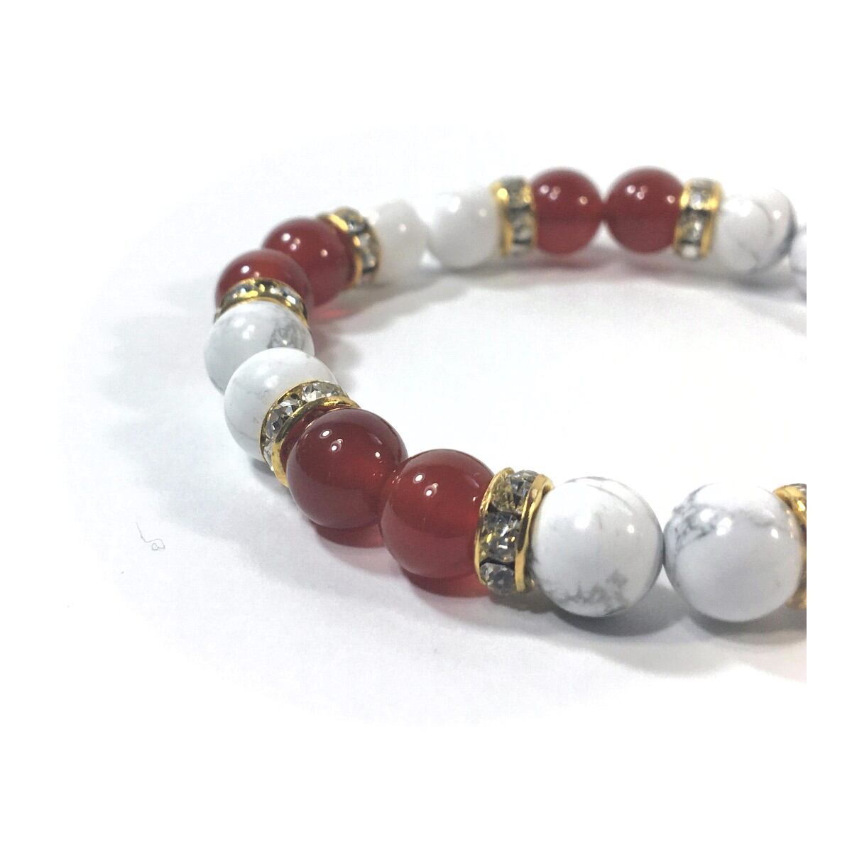 こちらは、8mm玉のハウライトと赤瑪瑙を使ったパワーストーンブレスレットです。シンプルなデザインでどんなコーディネートにも合わせやすいデザインに仕上げています。サイズは内周約15cmです。気になる方は是非この機会にどうぞ。