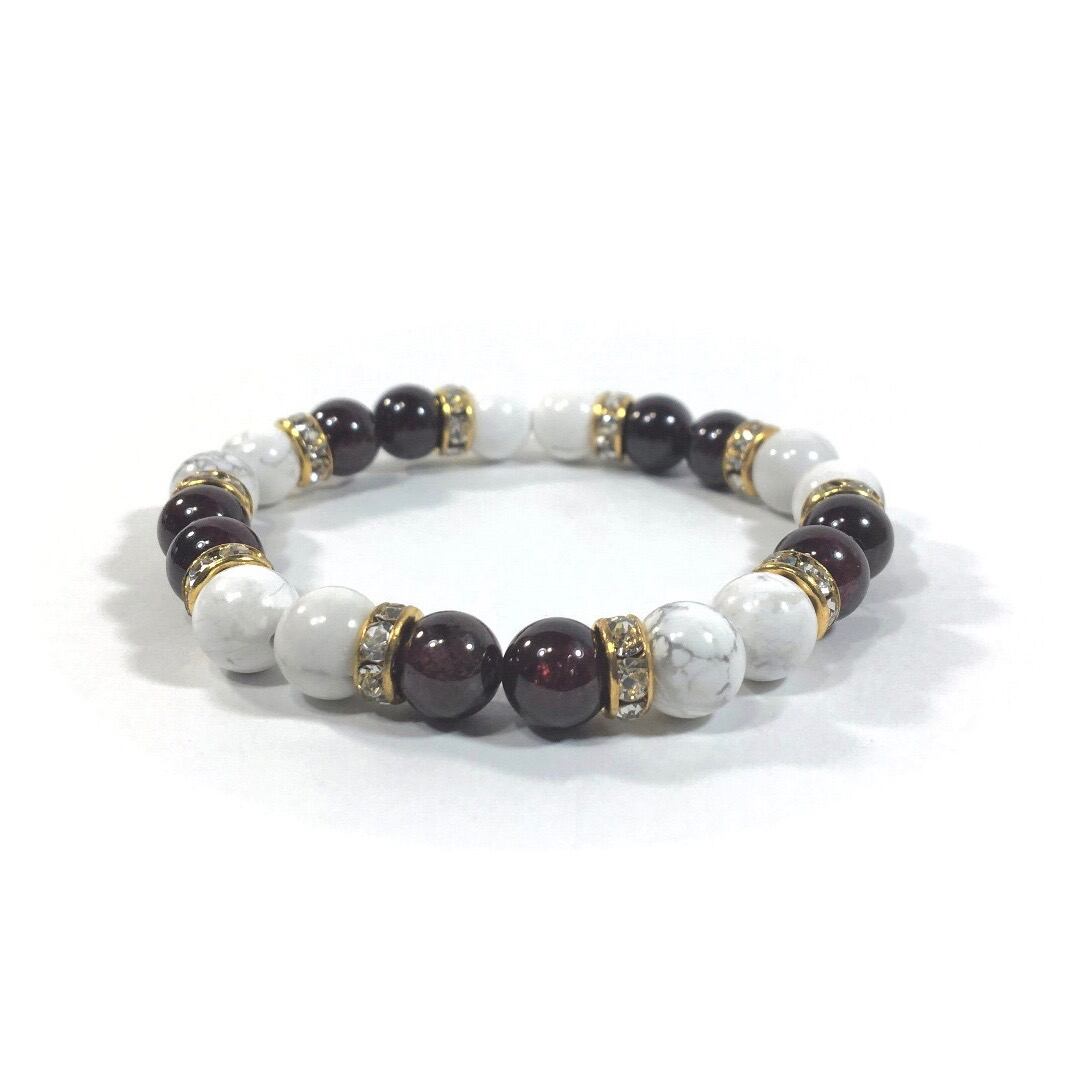 こちらは、8mm玉のハウライトとガーネットを使ったパワーストーンブレスレットです。シンプルなデザインでどんなコーディネートにも合わせやすいデザインに仕上げています。サイズは内周約15cmです。気になる方は是非この機会にどうぞ。