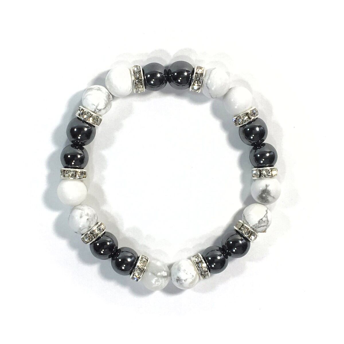 こちらは、8mm玉のハウライトとヘマタイトを使ったパワーストーンブレスレットです。シンプルなデザインでどんなコーディネートにも合わせやすいデザインに仕上げています。サイズは内周約15cmです。気になる方は是非この機会にどうぞ。