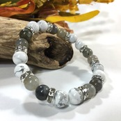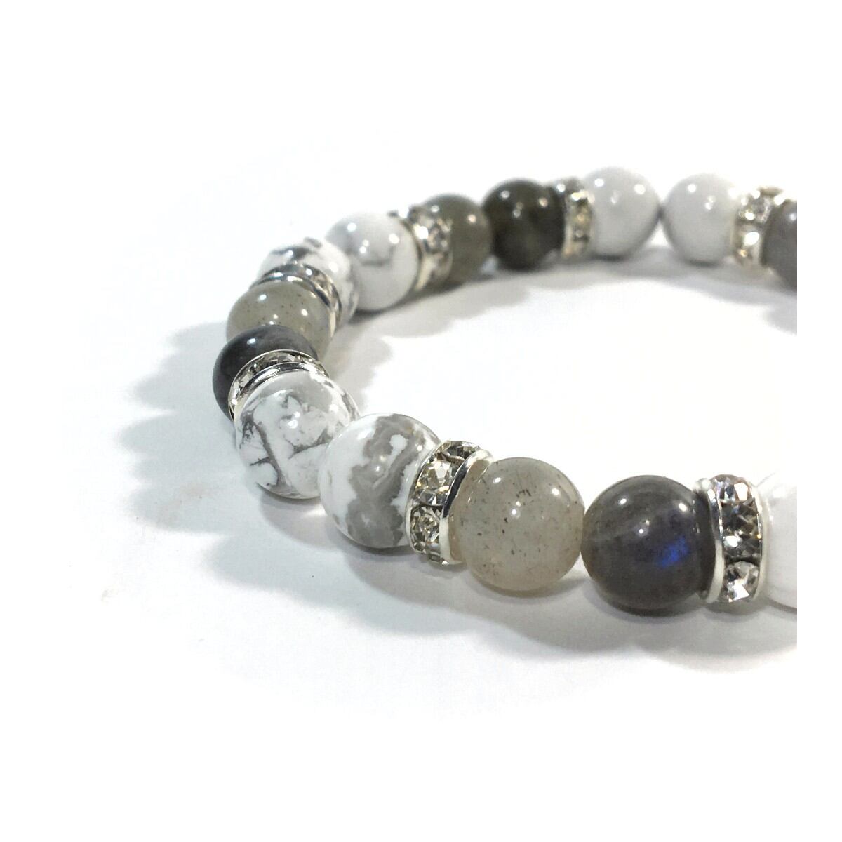 こちらは、8mm玉のハウライトとラブラドライトを使ったパワーストーンブレスレットです。シンプルなデザインでどんなコーディネートにも合わせやすいデザインに仕上げています。サイズは内周約15cmです。気になる方は是非この機会にどうぞ。