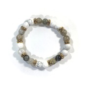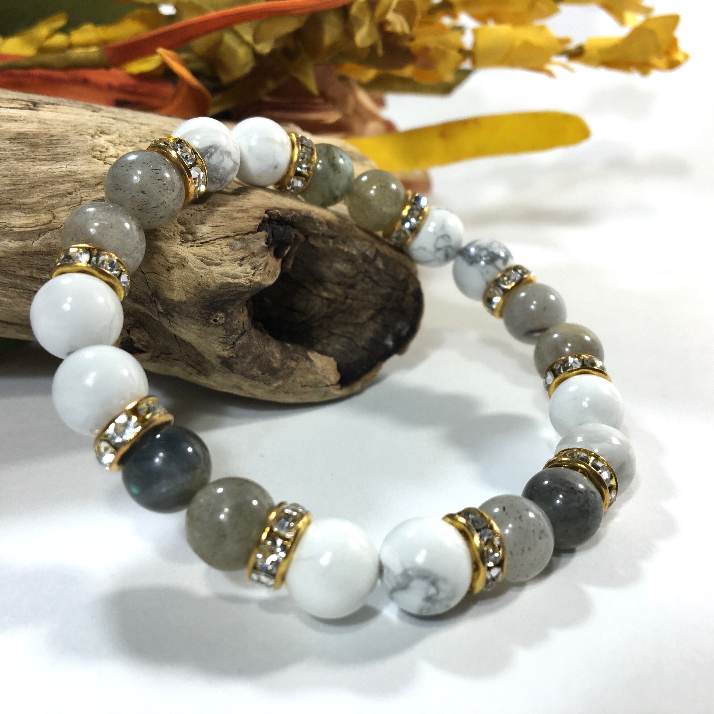 こちらは、8mm玉のハウライトとラブラドライトを使ったパワーストーンブレスレットです。シンプルなデザインでどんなコーディネートにも合わせやすいデザインに仕上げています。サイズは内周約15cmです。気になる方は是非この機会にどうぞ。