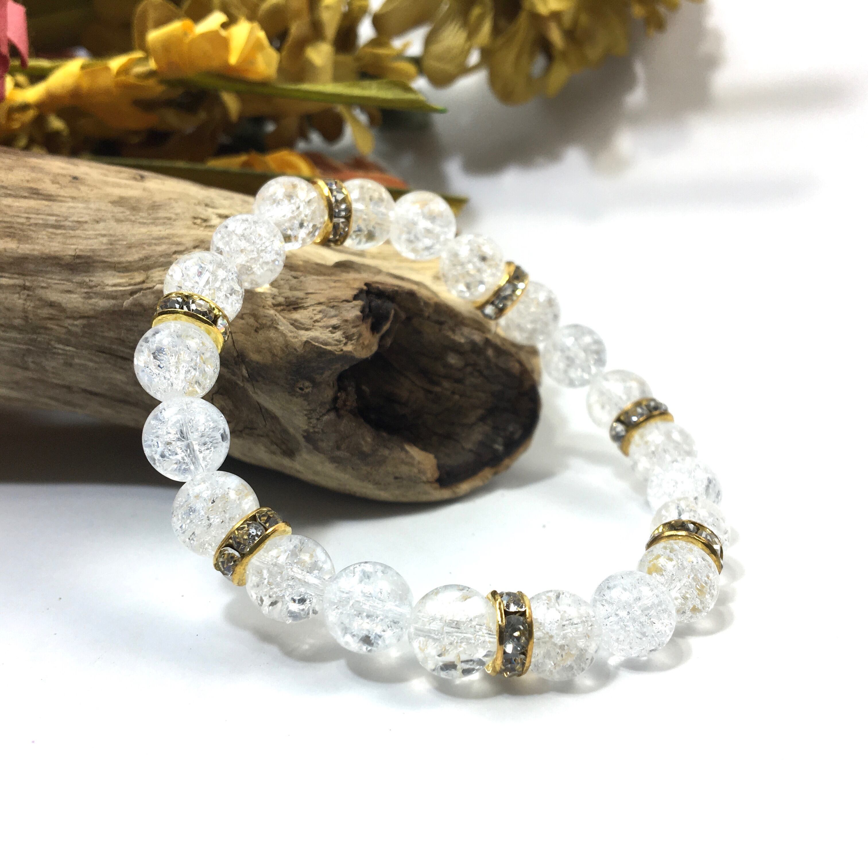 こちらは、8mm玉のクラック水晶を使ったパワーストーンブレスレットです。シンプルなデザインでどんなコーディネートにも合わせやすいデザインに仕上げています。サイズは内周約15cmです。気になる方は是非この機会にどうぞ。