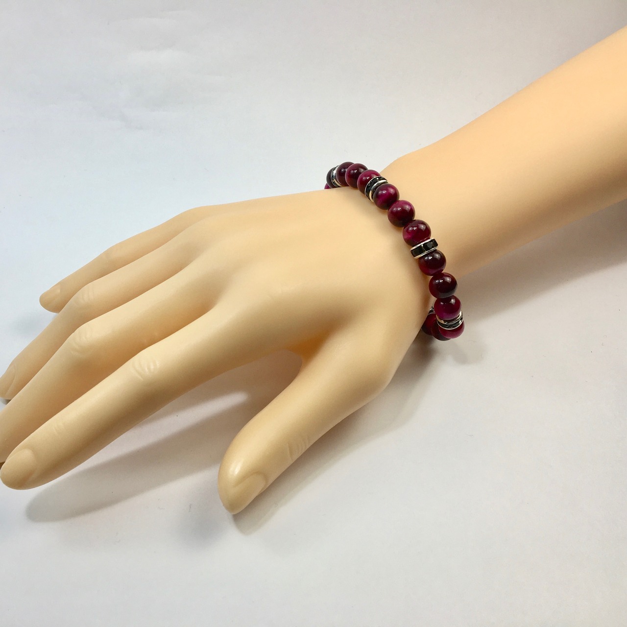 こちらは、8mm玉のピンクタイガーアイを使ったパワーストーンブレスレットです。シンプルなデザインでどんなコーディネートにも合わせやすいデザインに仕上げています。サイズは内周約15cmです。気になる方は是非この機会にどうぞ。