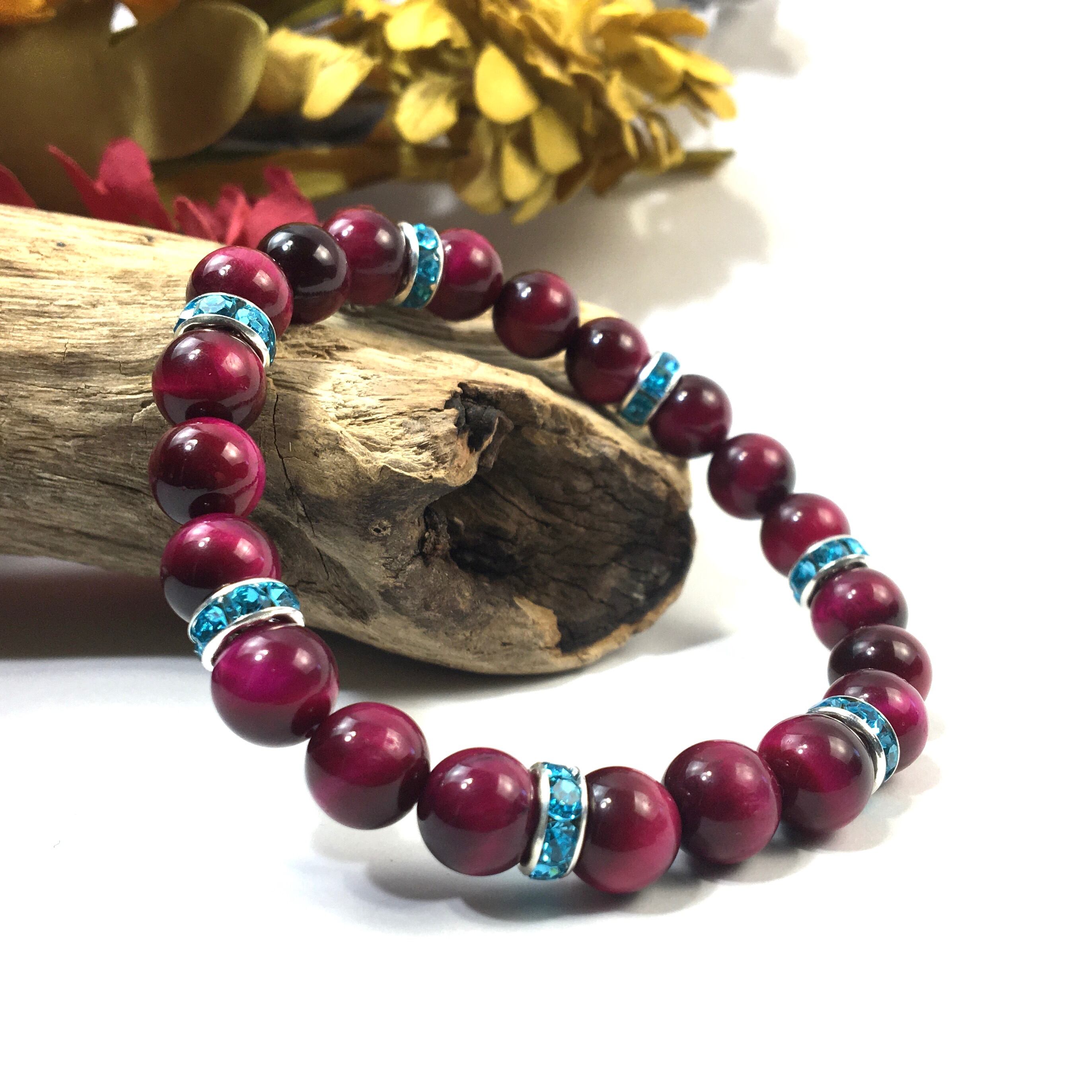こちらは、8mm玉のピンクタイガーアイを使ったパワーストーンブレスレットです。シンプルなデザインでどんなコーディネートにも合わせやすいデザインに仕上げています。サイズは内周約15cmです。気になる方は是非この機会にどうぞ。