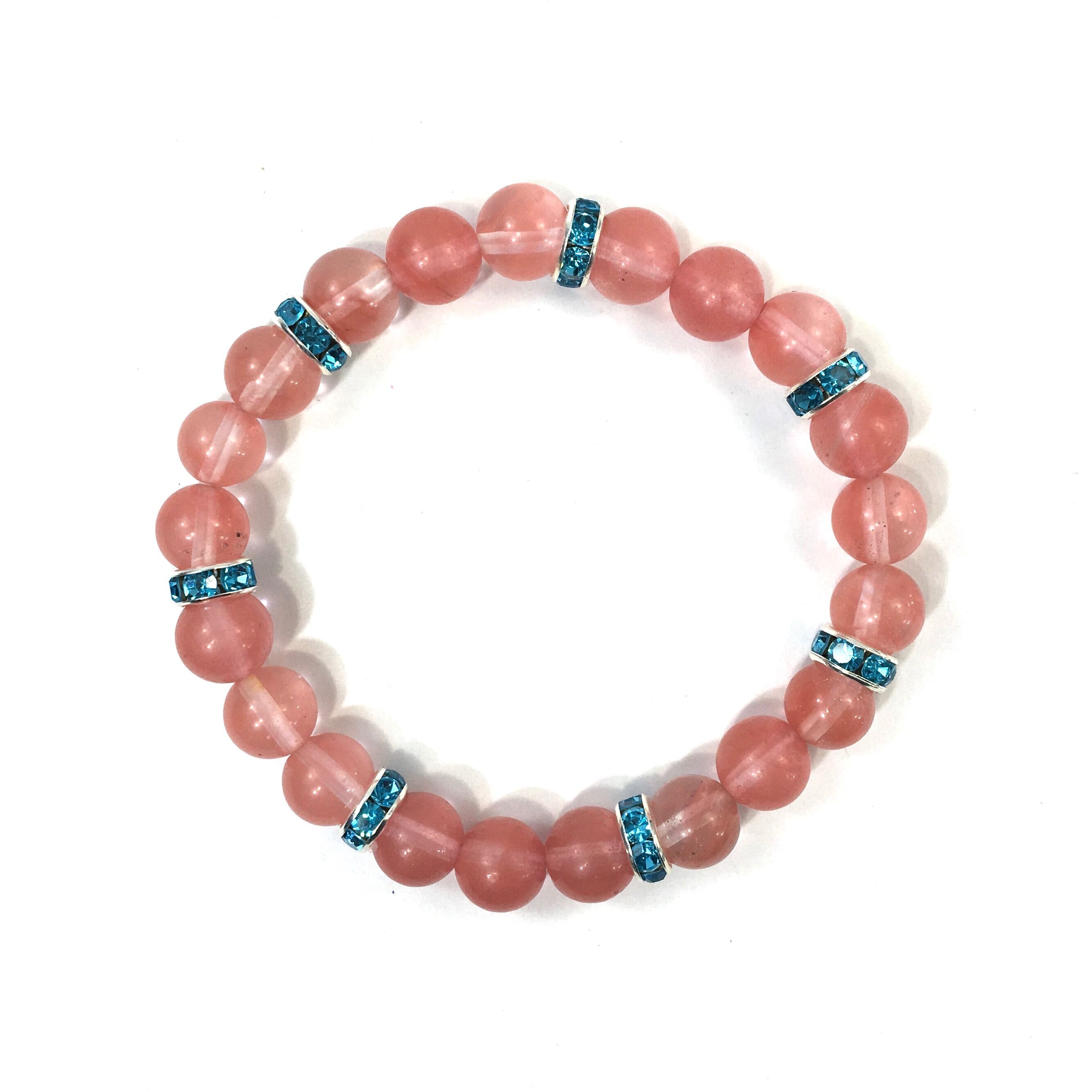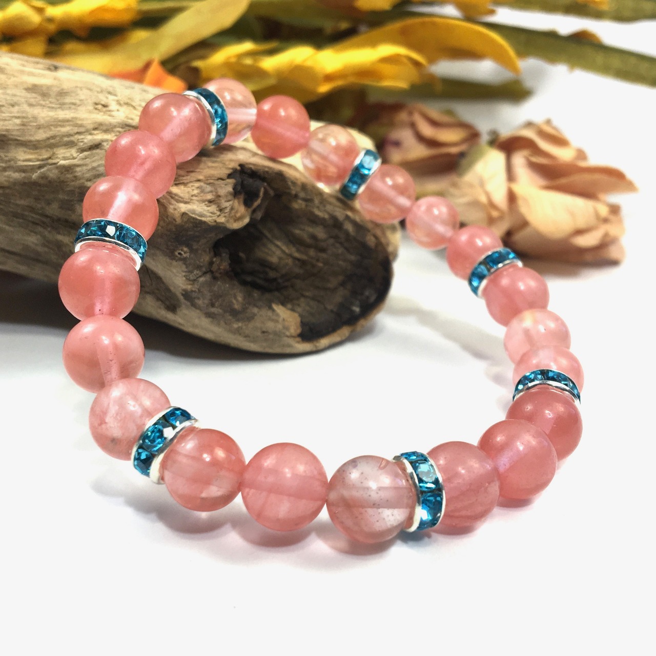 こちらは、8mm玉のチェリークォーツを使ったパワーストーンブレスレットです。シンプルなデザインでどんなコーディネートにも合わせやすいデザインに仕上げています。サイズは内周約15cmです。気になる方は是非この機会にどうぞ。