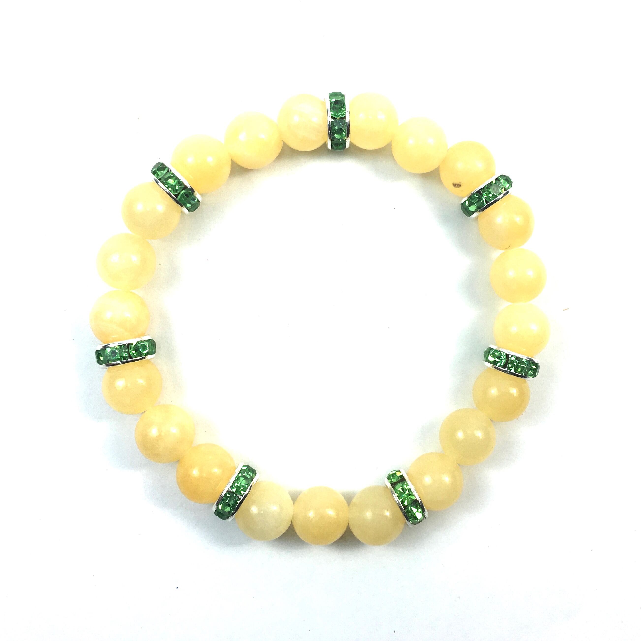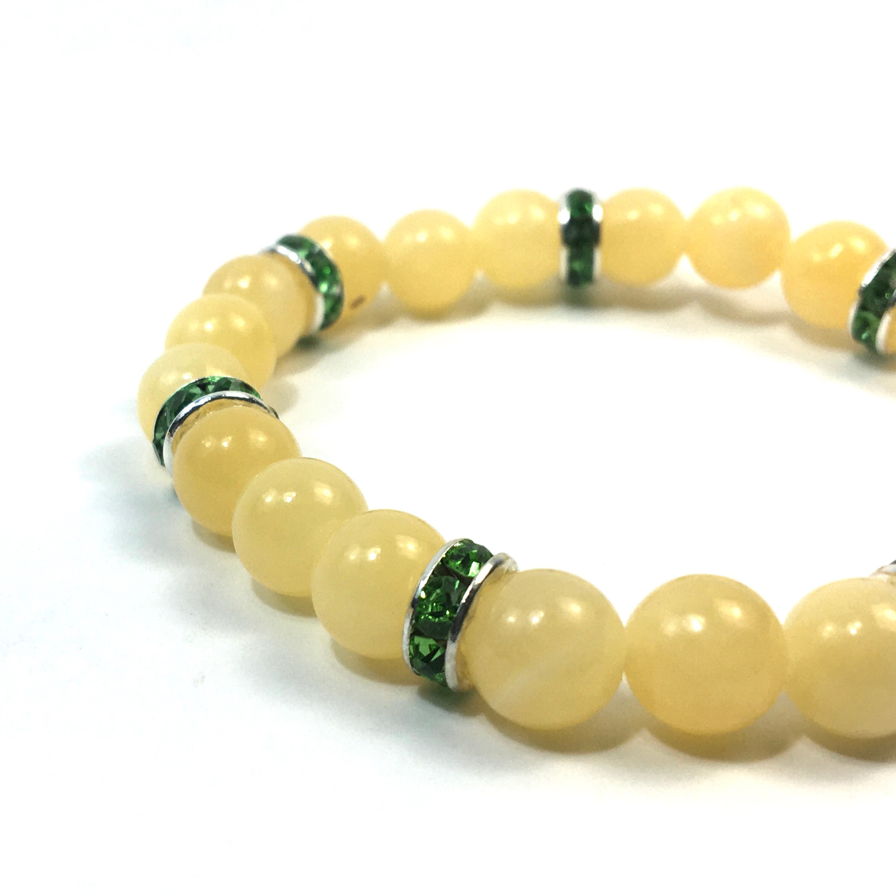 こちらは、8mm玉のアラゴナイトを使ったパワーストーンブレスレットです。シンプルなデザインでどんなコーディネートにも合わせやすいデザインに仕上げています。サイズは内周約15cmです。気になる方は是非この機会にどうぞ。