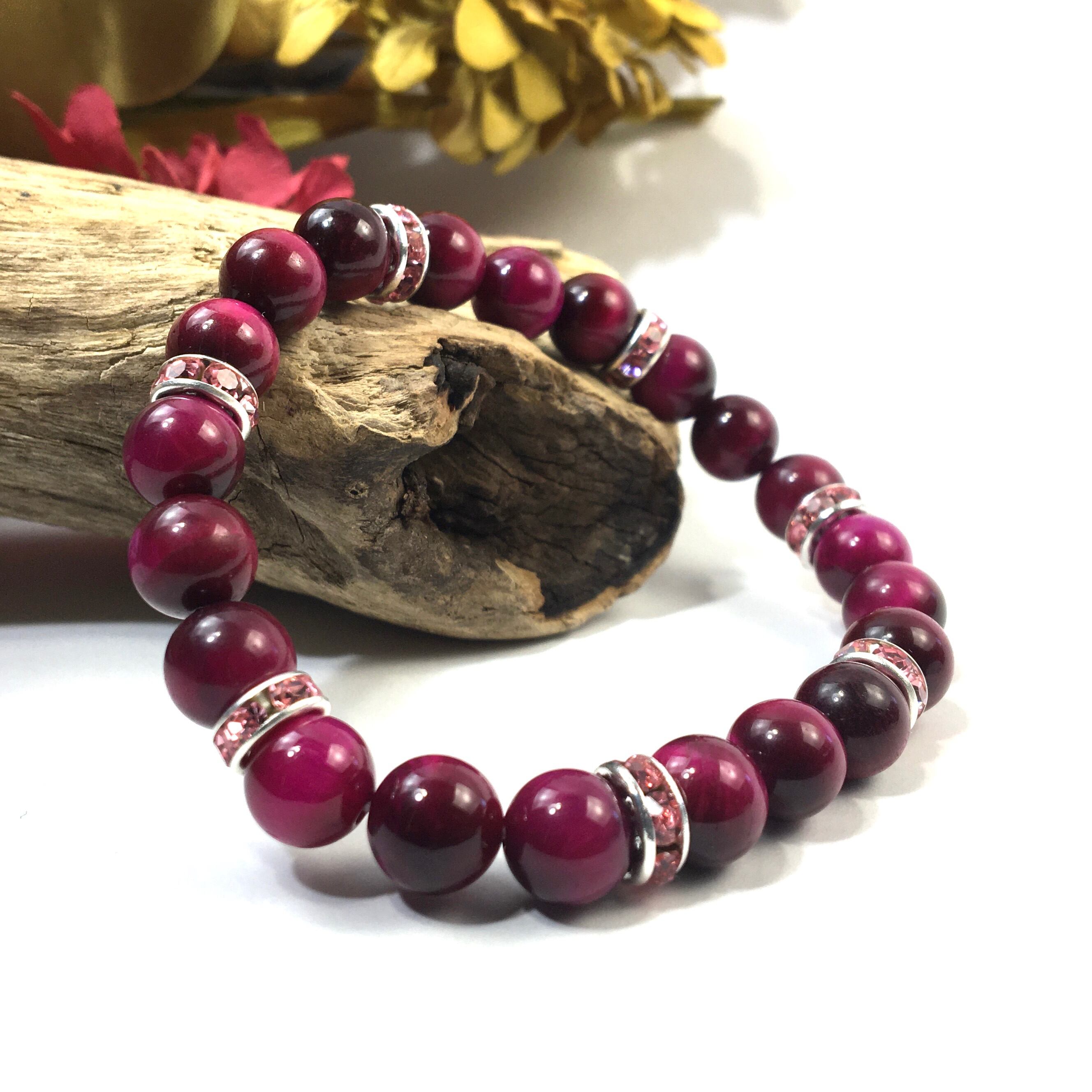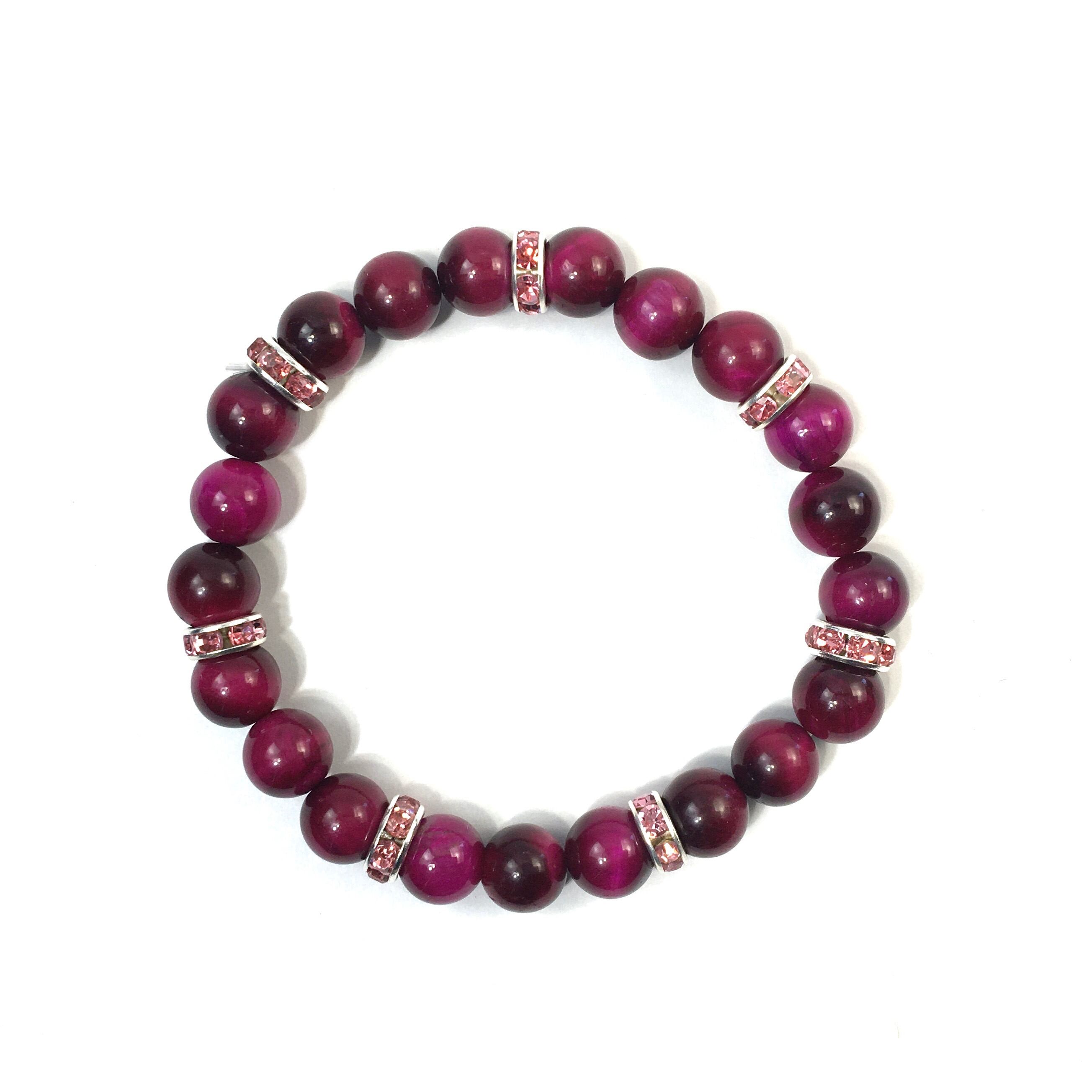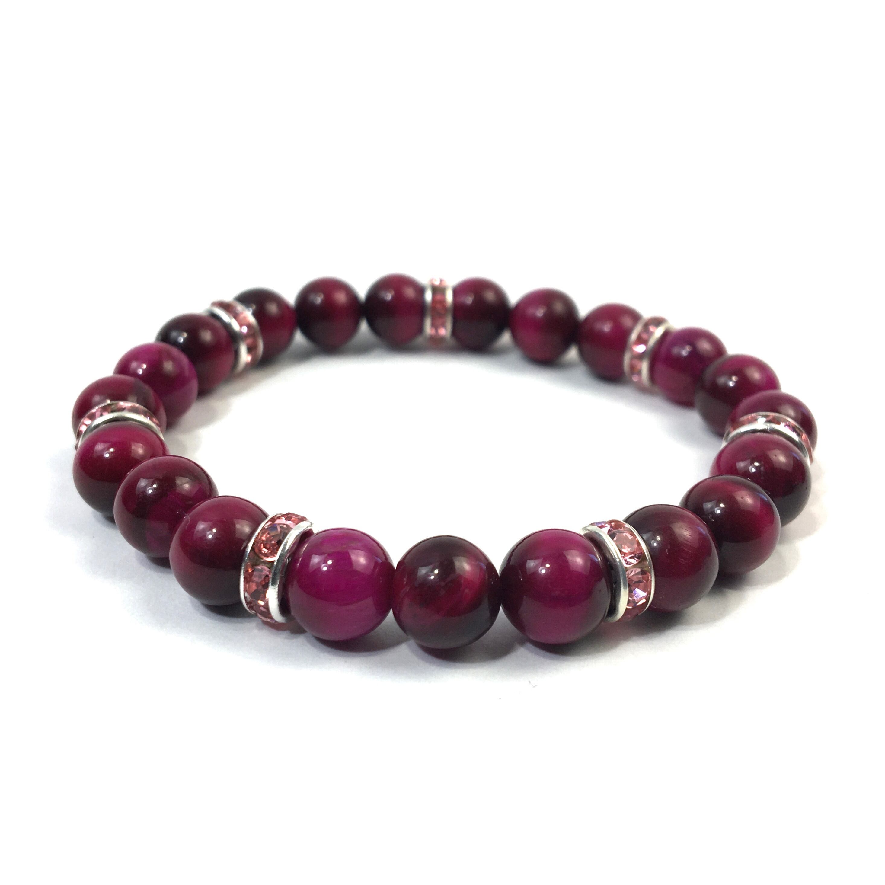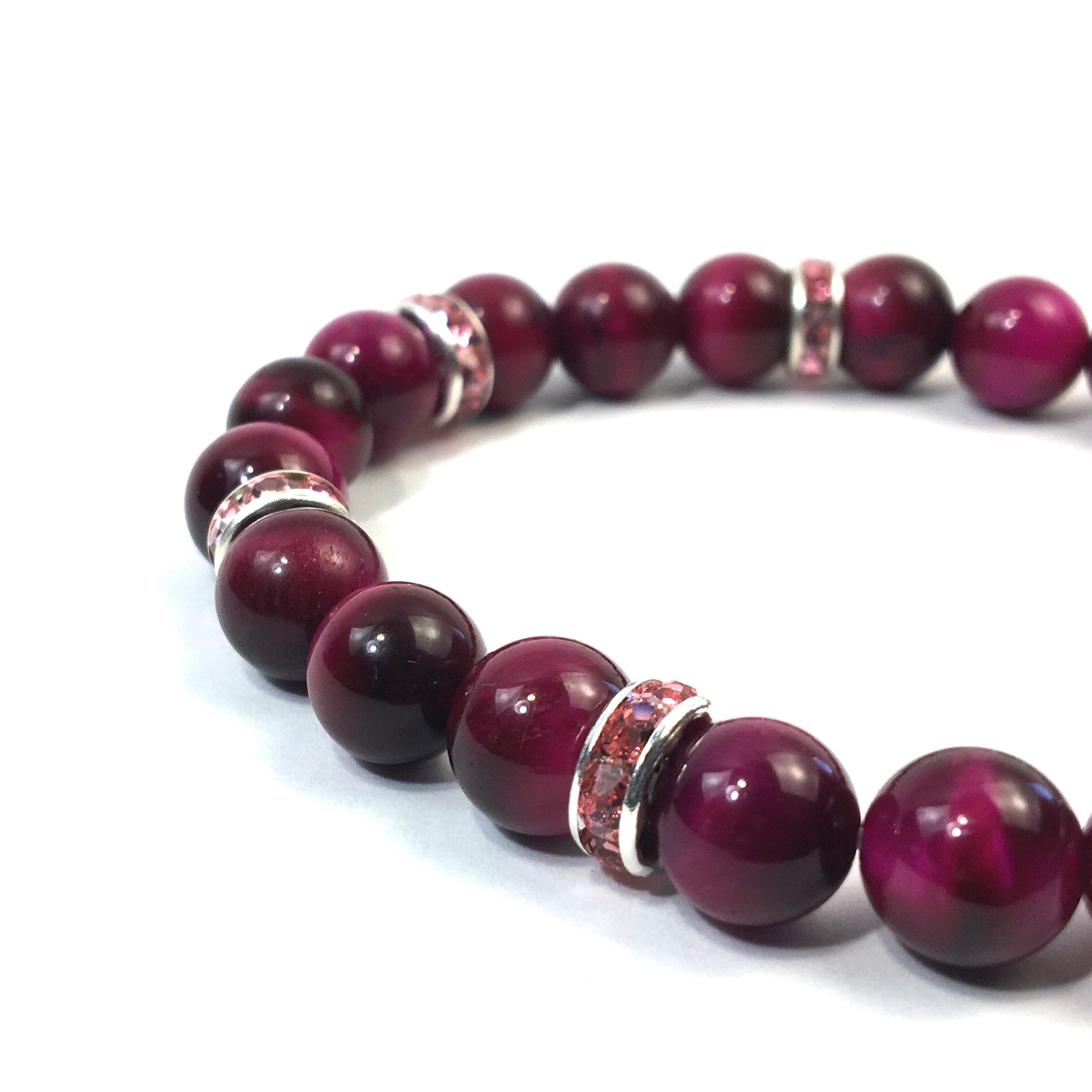 こちらは、8mm玉のピンクタイガーアイを使ったパワーストーンブレスレットです。シンプルなデザインでどんなコーディネートにも合わせやすいデザインに仕上げています。サイズは内周約15cmです。気になる方は是非この機会にどうぞ。