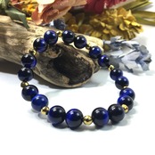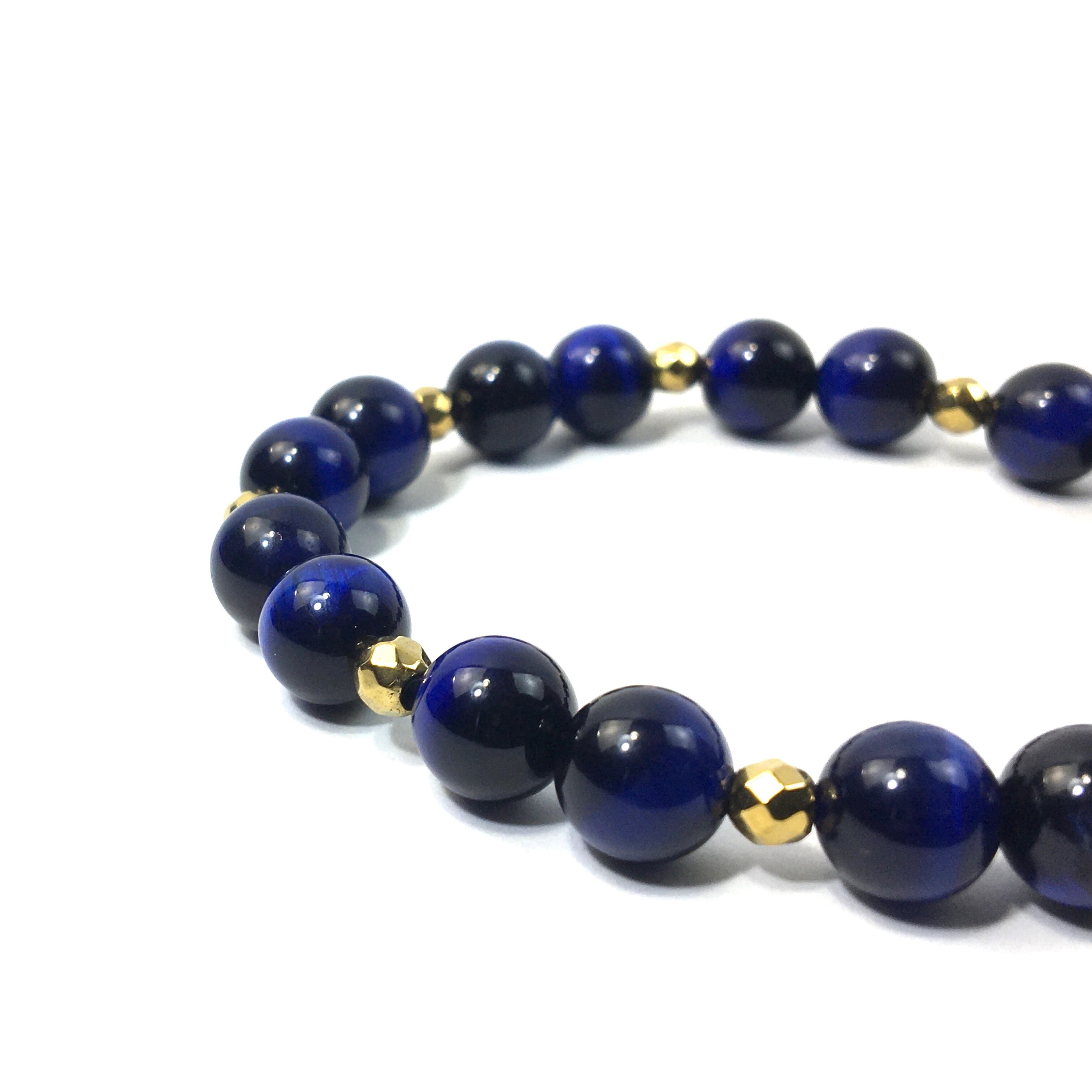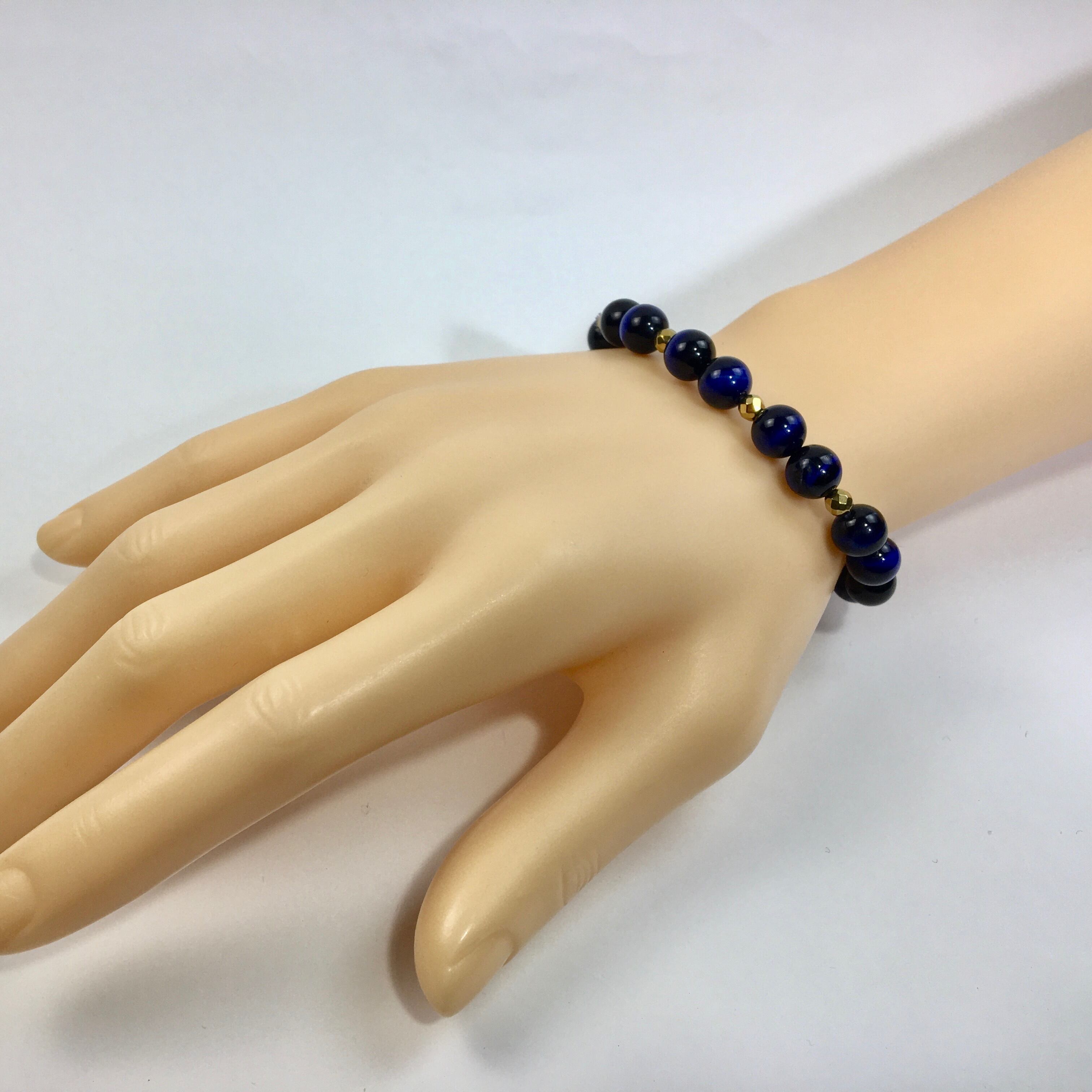 こちらは、8mm玉のブルータイガーアイを使ったパワーストーンブレスレットです。今回は石との間にはゴールドのヘマタイトを加えアクセントとしております。シンプルなデザインでどんなコーディネートにも合わせやすいデザインに仕上げています。サイズは内周約15cmです。気になる方は是非この機会にどうぞ。