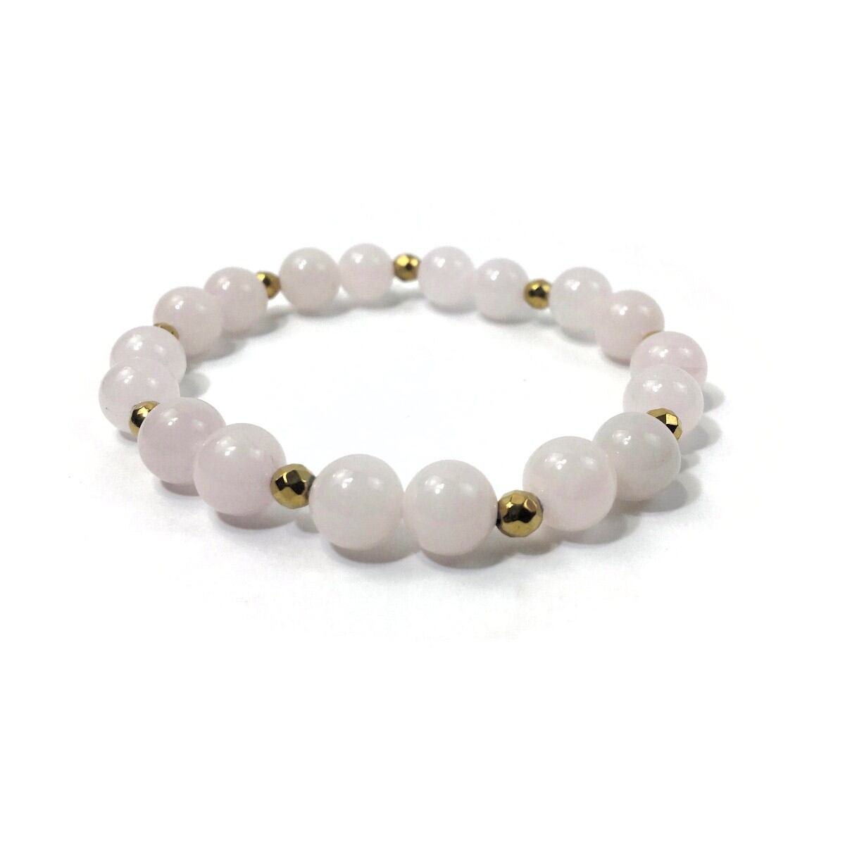 こちらは、8mm玉のローズクォーツを使ったパワーストーンブレスレットです。今回は石との間にはゴールドのヘマタイトを加えアクセントとしております。シンプルなデザインでどんなコーディネートにも合わせやすいデザインに仕上げています。サイズは内周約15cmです。気になる方は是非この機会にどうぞ。