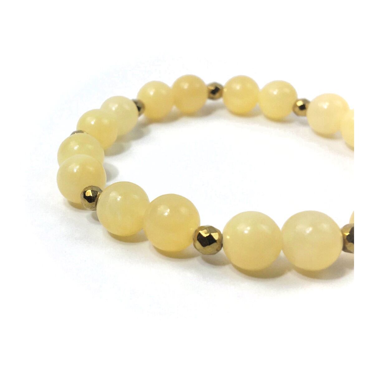 こちらは、8mm玉のアラゴナイトを使ったパワーストーンブレスレットです。今回は石との間にはゴールドのヘマタイトを加えアクセントとしております。シンプルなデザインでどんなコーディネートにも合わせやすいデザインに仕上げています。サイズは内周約15cmです。気になる方は是非この機会にどうぞ。