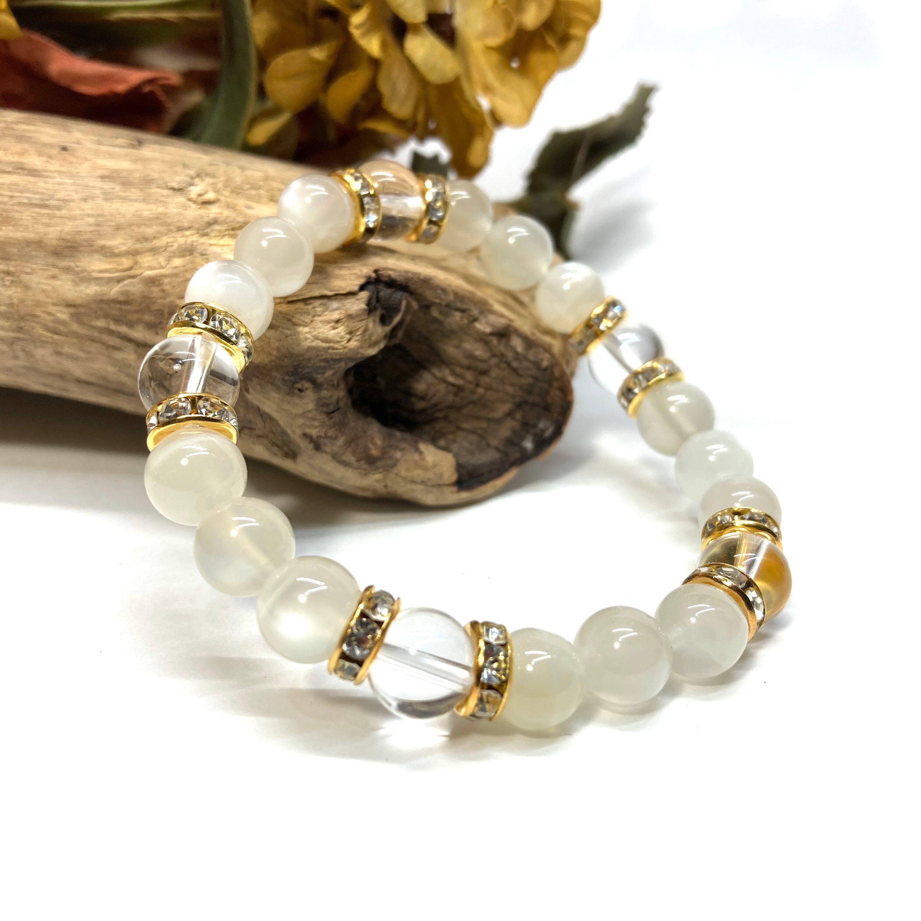 こちらは、8mm玉のムーンストーンと水晶を使ったパワーストーンブレスレットです。シンプルなデザインでどんなコーディネートにも合わせやすいデザインに仕上げています。サイズは内周約15cmです。気になる方は是非この機会にどうぞ。