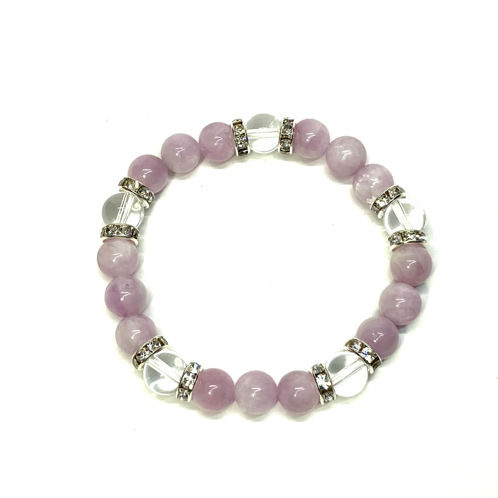 こちらは、8mm玉のクンツァイトと水晶を使ったパワーストーンブレスレットです。シンプルなデザインでどんなコーディネートにも合わせやすいデザインに仕上げています。サイズは内周約15cmです。気になる方は是非この機会にどうぞ。