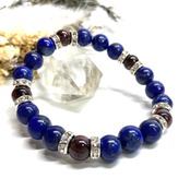 こちらは、8mm玉のラピスラズリとガーネットを使ったパワーストーンブレスレットです。今回は五芒星デザインで石を配置しております。五芒星は厄除・開運を願うデザインと重宝されているデザインです。サイズは内周 約15cmです。気になる方は是非この機会にどうぞ。