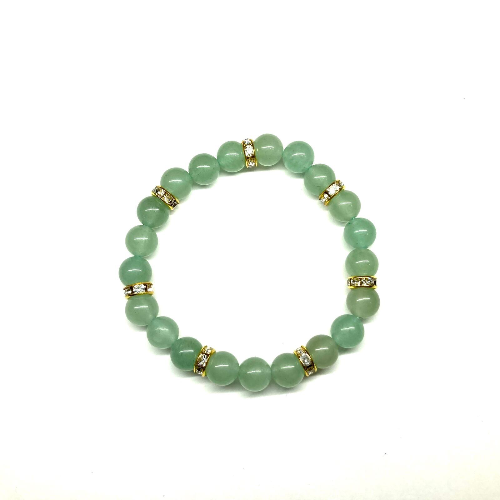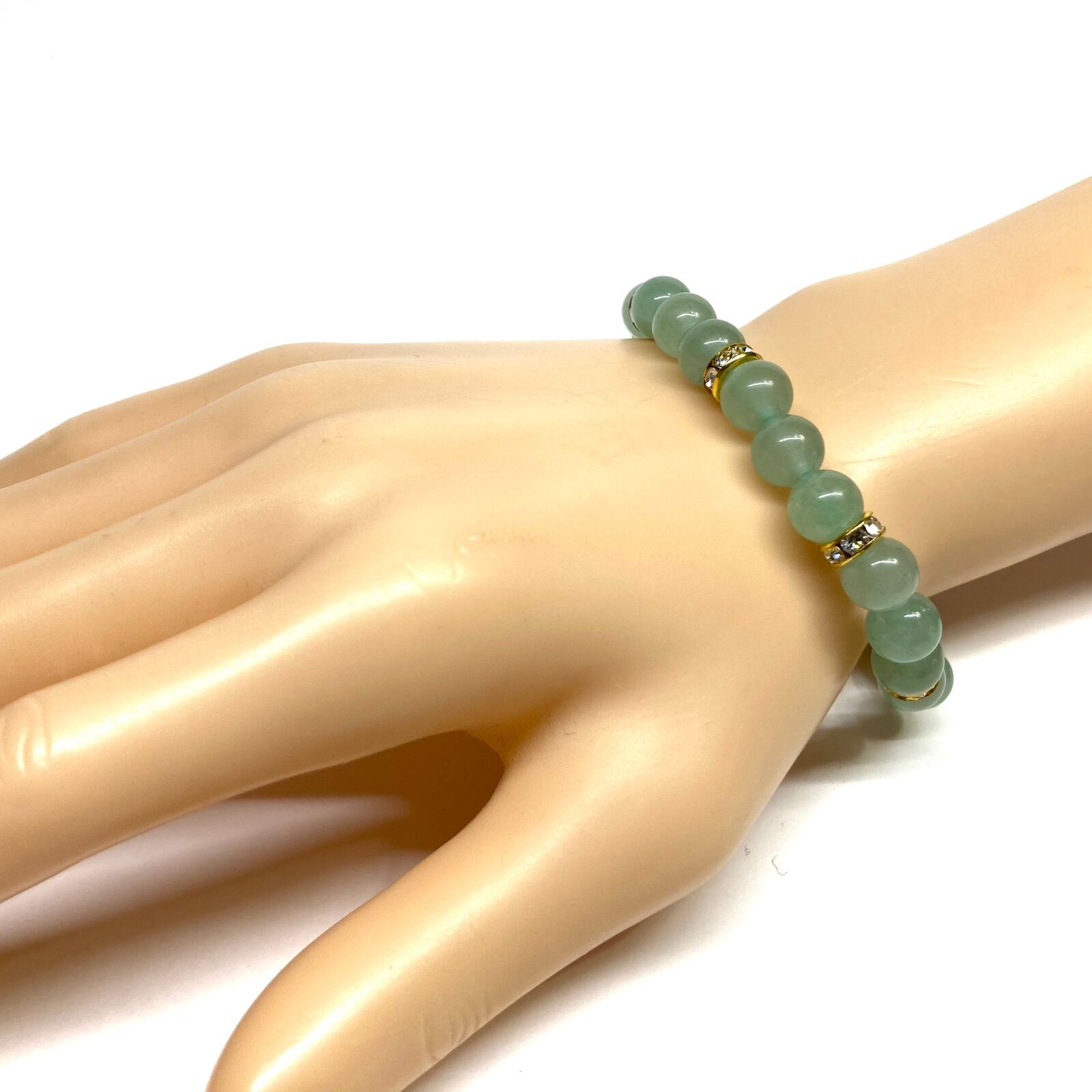 こちらは、8mm玉のアベンチュリンを使ったパワーストーンブレスレットです。シンプルなデザインでどんなコーディネートにも合わせやすいデザインに仕上げています。サイズは内周約15cmです。気になる方は是非この機会にどうぞ。