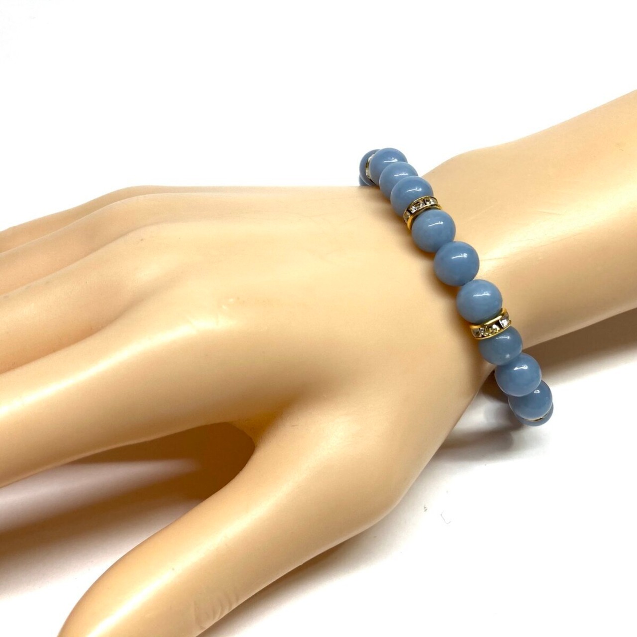 こちらは、8mm玉のエンジェライトを使ったパワーストーンブレスレットです。シンプルなデザインでどんなコーディネートにも合わせやすいデザインに仕上げています。サイズは内周約15cmです。気になる方は是非この機会にどうぞ。