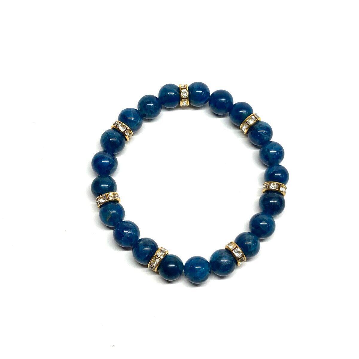 こちらは、8mm玉のアパタイトを使ったパワーストーンブレスレットです。シンプルなデザインでどんなコーディネートにも合わせやすいデザインに仕上げています。サイズは内周約15cmです。気になる方は是非この機会にどうぞ。
