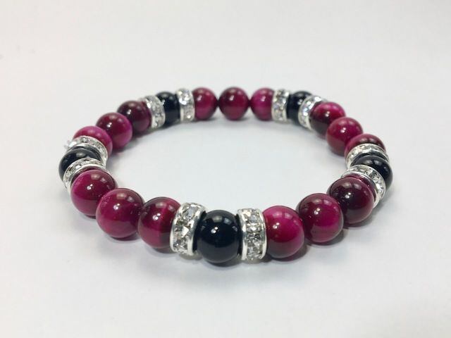 こちらは、8mm玉のピンクタイガーアイとオニキスを使ったパワーストーンブレスレットです。シンプルなデザインでどんなコーディネートにも合わせやすいデザインに仕上げています。サイズは内周約15cmです。気になる方は是非この機会にどうぞ。