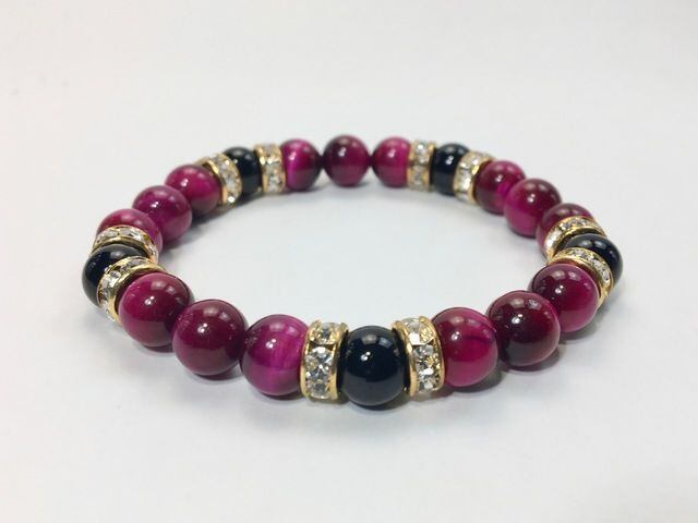 こちらは、8mm玉のピンクタイガーアイとオニキスを使ったパワーストーンブレスレットです。シンプルなデザインでどんなコーディネートにも合わせやすいデザインに仕上げています。サイズは内周約15cmです。気になる方は是非この機会にどうぞ。