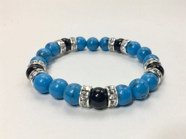 こちらは、8mm玉のターコイズとオニキスを使ったパワーストーンブレスレットです。シンプルなデザインでどんなコーディネートにも合わせやすいデザインに仕上げています。サイズは内周約15cmです。気になる方は是非この機会にどうぞ。