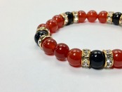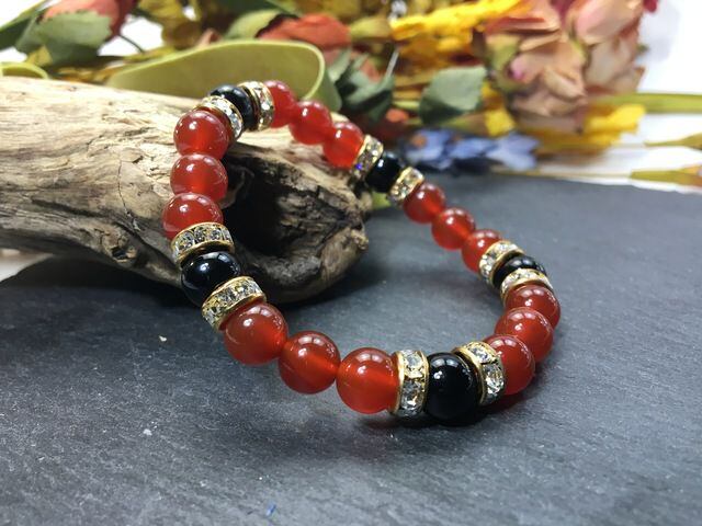 こちらは、8mm玉の赤瑪瑙とオニキスを使ったパワーストーンブレスレットです。シンプルなデザインでどんなコーディネートにも合わせやすいデザインに仕上げています。サイズは内周約15cmです。気になる方は是非この機会にどうぞ。