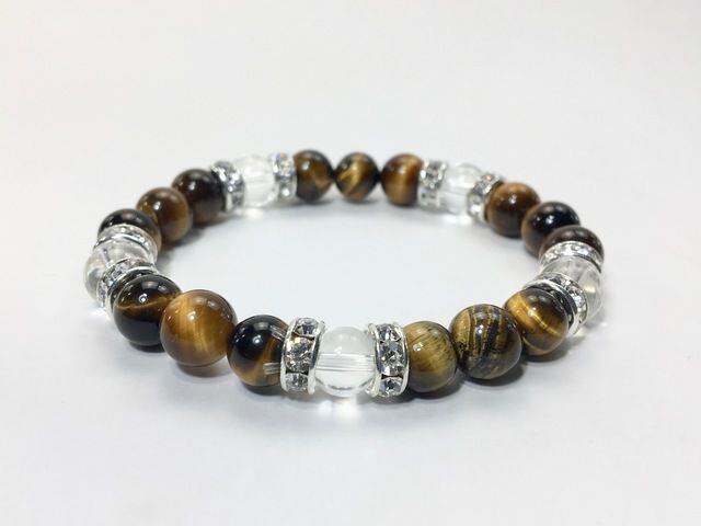 こちらは、8mm玉のタイガーアイと水晶を使ったパワーストーンブレスレットです。シンプルなデザインでどんなコーディネートにも合わせやすいデザインに仕上げています。サイズは内周約15cmです。気になる方は是非この機会にどうぞ。