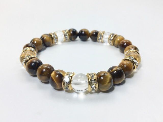 こちらは、8mm玉のタイガーアイと水晶を使ったパワーストーンブレスレットです。シンプルなデザインでどんなコーディネートにも合わせやすいデザインに仕上げています。サイズは内周約15cmです。気になる方は是非この機会にどうぞ。
