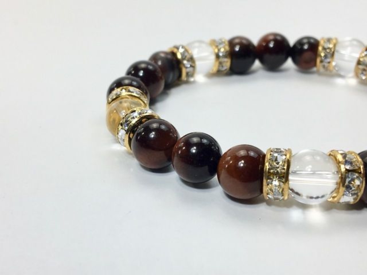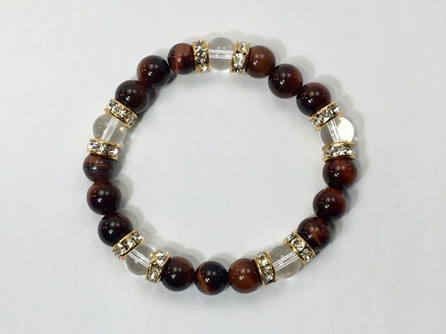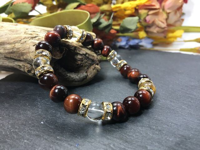 こちらは、8mm玉のレッドタイガーアイと水晶を使ったパワーストーンブレスレットです。シンプルなデザインでどんなコーディネートにも合わせやすいデザインに仕上げています。サイズは内周約15cmです。気になる方は是非この機会にどうぞ。