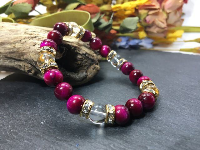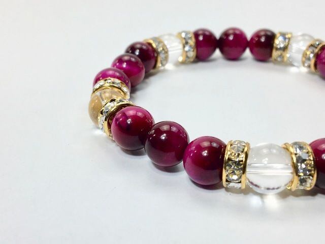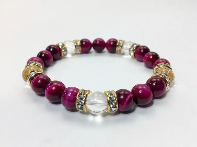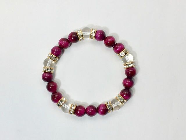 こちらは、8mm玉のピンクタイガーアイと水晶を使ったパワーストーンブレスレットです。シンプルなデザインでどんなコーディネートにも合わせやすいデザインに仕上げています。サイズは内周約15cmです。気になる方は是非この機会にどうぞ。