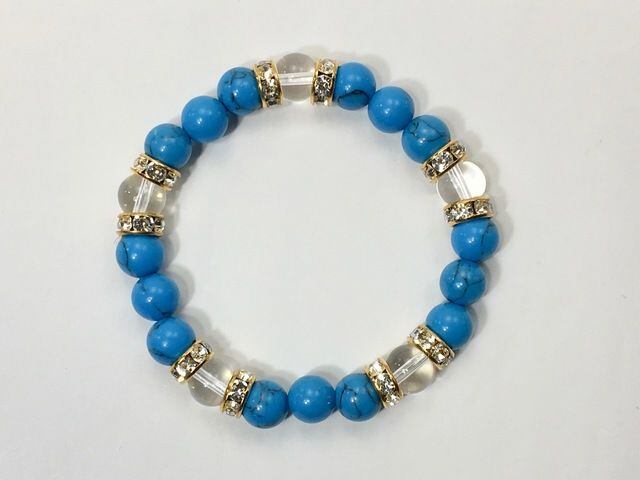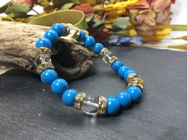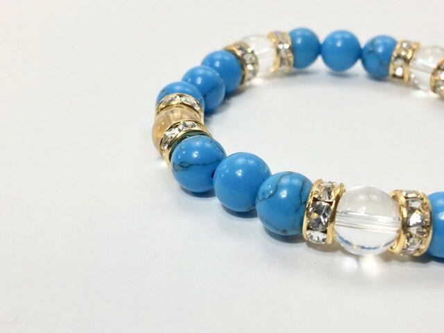 こちらは、8mm玉のターコイズと水晶を使ったパワーストーンブレスレットです。シンプルなデザインでどんなコーディネートにも合わせやすいデザインに仕上げています。サイズは内周約15cmです。気になる方は是非この機会にどうぞ。