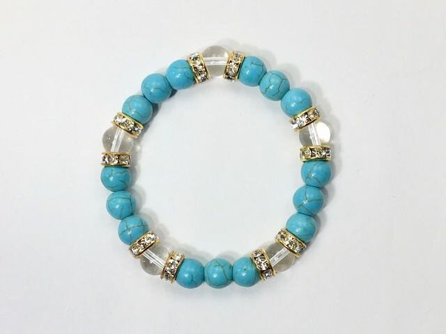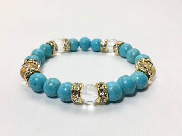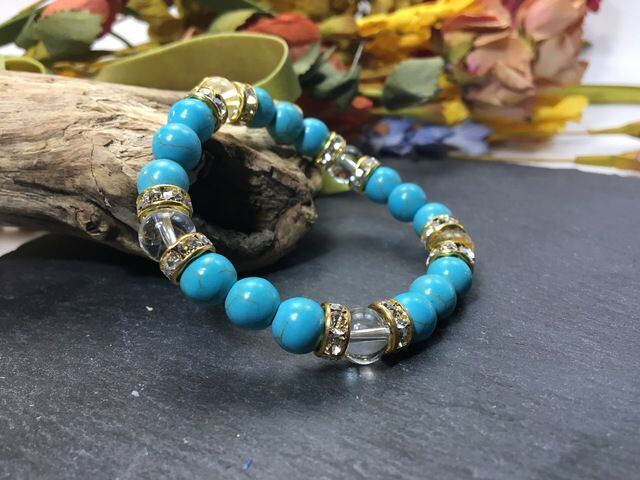 こちらは、8mm玉のターコイズと水晶を使ったパワーストーンブレスレットです。シンプルなデザインでどんなコーディネートにも合わせやすいデザインに仕上げています。サイズは内周約14cmです。気になる方は是非この機会にどうぞ。